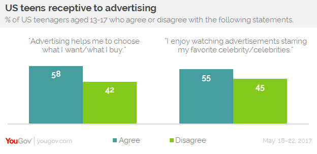但是,青少年在信任广告这个问题上仍然有分歧。YouGov的调查发现,47%的青少年在某重程度上相信看到、读过或听到的广告;46%的青少年受访者不相信广告;还有6%不确定。