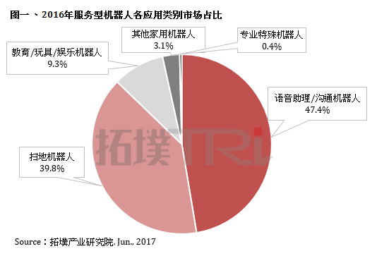 在AI(人工智能)蓬勃发展的带动下,机器人已能以自然语言与人类沟通互动。拓墣产业研究院最新《人工智能技术大跃进,智能机器人商机无限》报告指出,2016年整体服务型机器人销售量中,语音助理机器人占市场最大宗,其市占率近五成,其次为扫地机器人,其市占率为近四成。