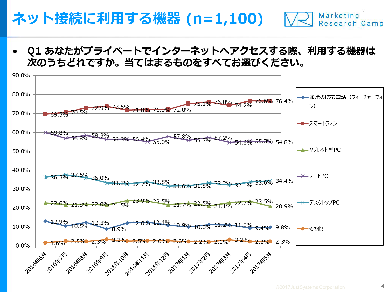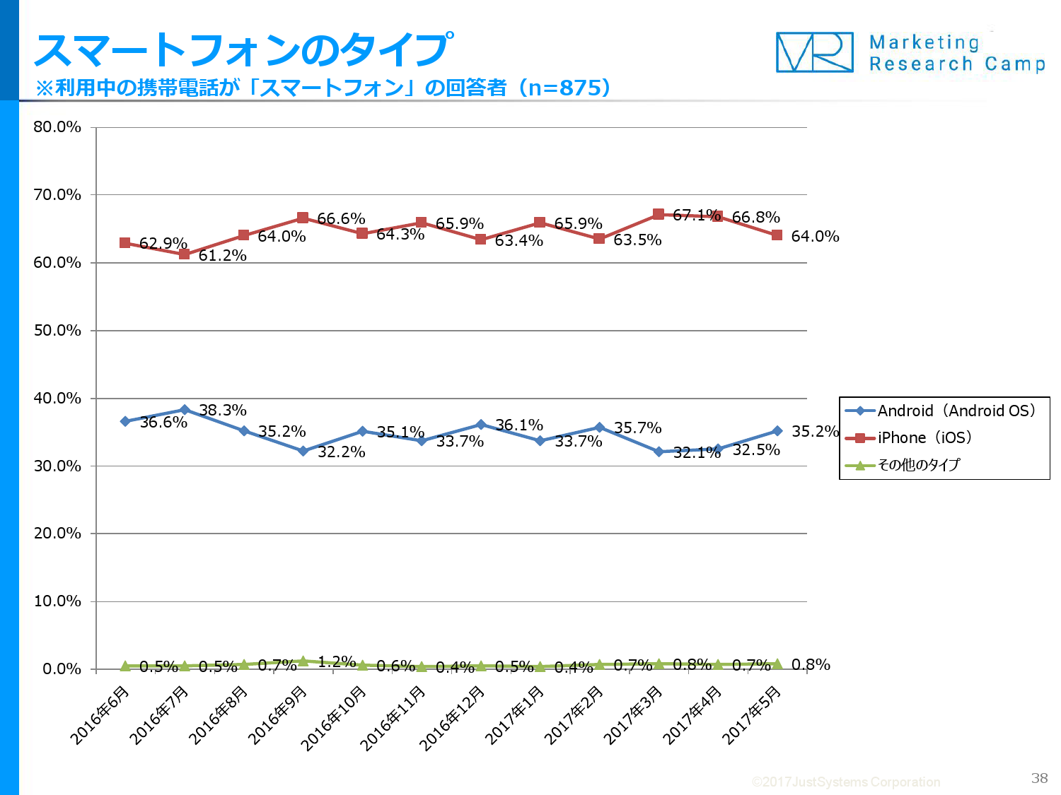 调查同时也对875位持有智能设备的用户进行调查,从去年4月开始iOS设备在日本全线调价之后,在日本的持有率快速增长,iOS设备的持有率几乎超过安卓的一倍。截止5月,iOS在日本的持有率已经达到64%。