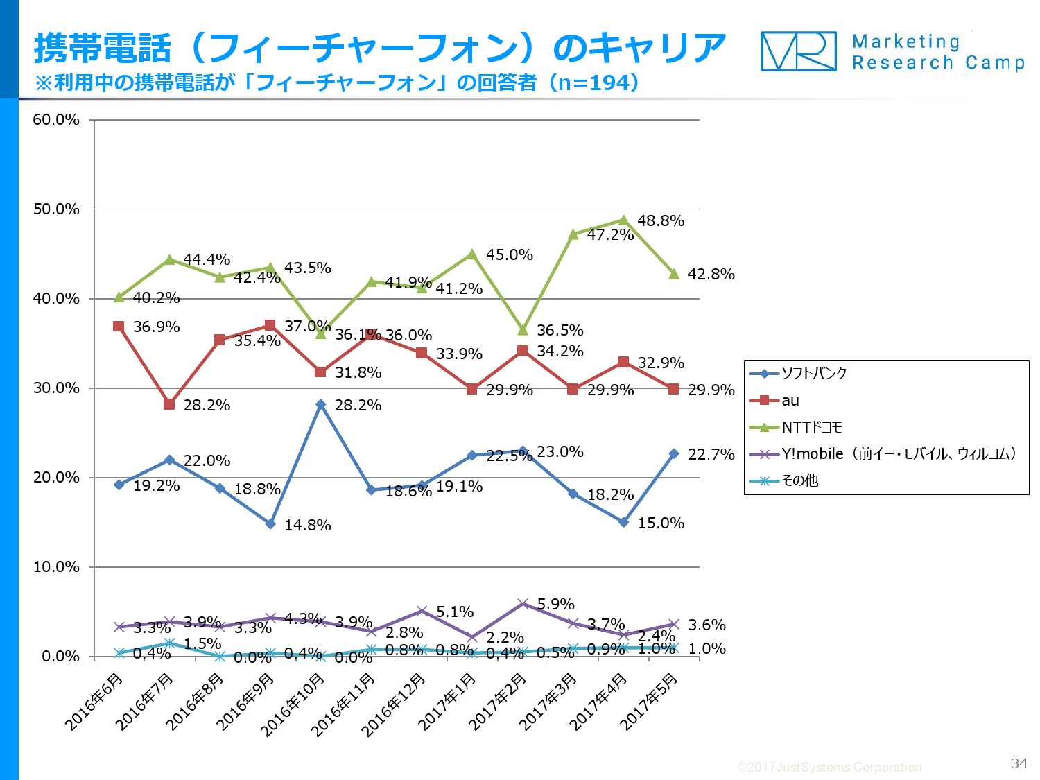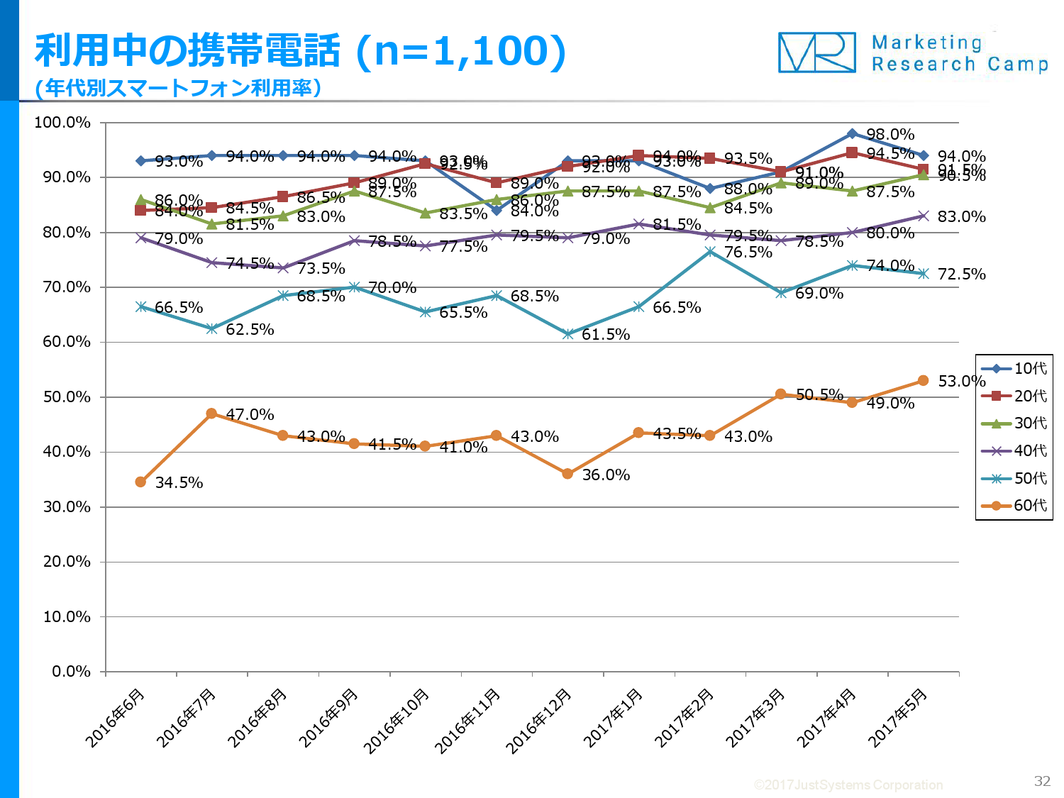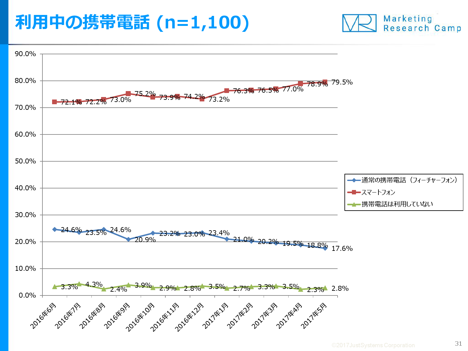 首先是关于智能手机持有率方面的调查,从近一年的调查趋势来看,我们可以明显发现日本市场智能手机的排挤了越来越高的。截止今年5月,79.5%的日本群众都在使用智能手机。与此相对的是功能机市场的衰退持有量逐年走低,目前仍有17.6%的日本用户在使用功能机。除此之外,我们还可以看到约有2.8%的日本人不使用移动设备,这些主要都是老人以及小孩。