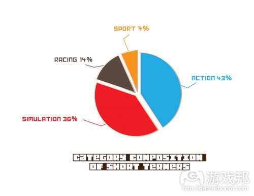 长期游戏多属于策略游戏(占比达29%),而短期游戏则以动作游戏为主导(占比达43%),模拟游戏在长短期游戏中都有较高人气(在短期游戏中占比36%,在长期游戏中占比22%)。另外需要注意的是,这项调查结果并不意味着动作游戏更容易迅速蹿红,只能说明此类游戏机制的粘性比其他手机游戏更高。