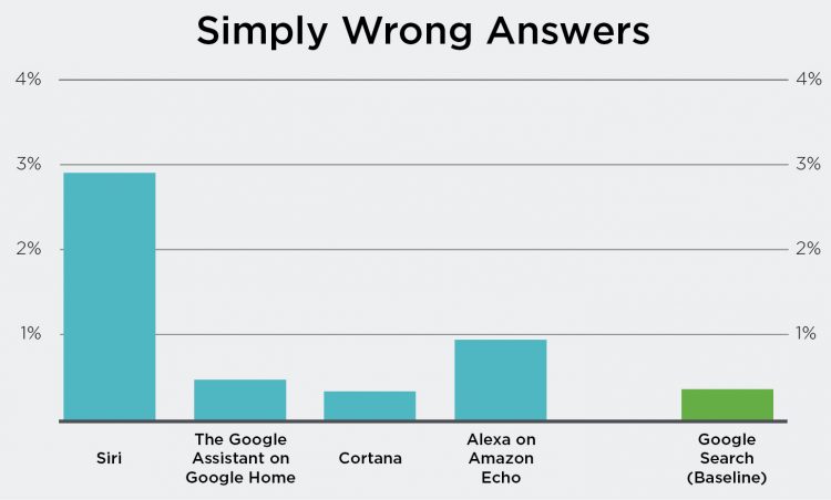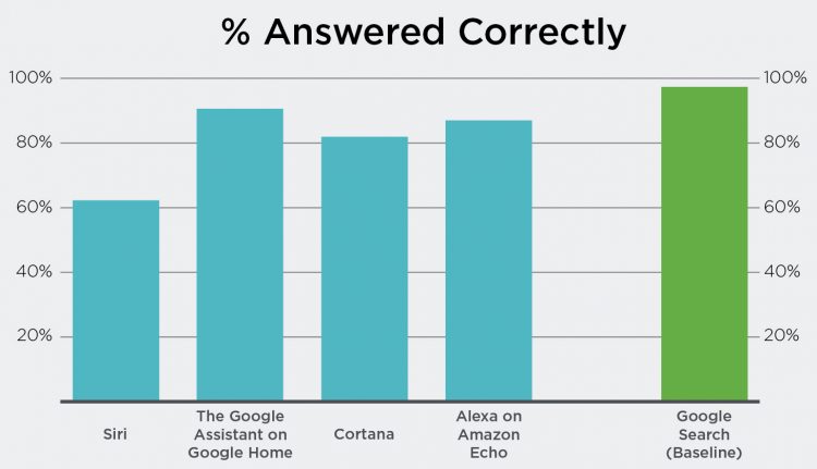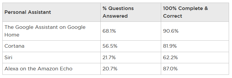 当个人助手回答问题而非搜索结果时,谷歌助手的正确率最高,其次是亚马逊的Alexa和微软小娜。