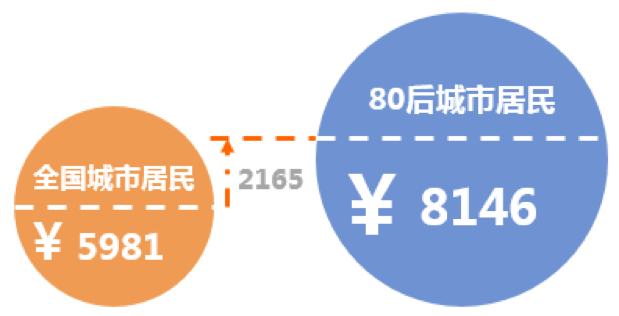 80后作为当下中国劳动力市场的重要组成部分,大多已成家立业(已婚78.7%,全职工作者94.75%),处在事业上升期,收入水平较高,蕴含着巨大的消费潜力。据CNRS数据显示,80后平均月收入 8146元,是总体城市居民的1.36倍。