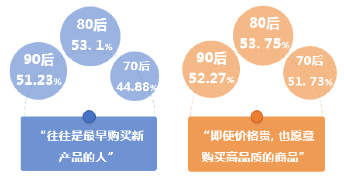 与此同时,80后为代表的年轻人对新产品购买欲望强烈,且愿意为高品质商品买单。他们赞同“往往是最早购买新产品的人”的比例为53.1%,亦有53.75%的比例倾向“即便价格贵,也愿意购买高品质商品”。