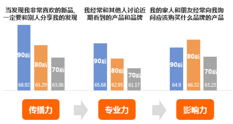 毋庸置疑,年轻群体的社交活动更为活跃,相互之间对各类产品与品牌进行分享和讨论也是工作罅隙或茶余饭后社交活动的重要组成部分。更重要的是,以80后为代表的年轻人群对于家庭其他成员有更强的影响力,80后赞同“我的家人和朋友经常向我询问应该购买什么品牌的产品”的比例为66.32%。