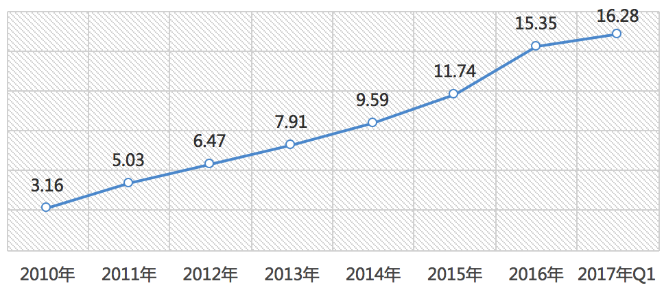 上图:2012-2017年中国城市居民中漱口水的渗透率(%)