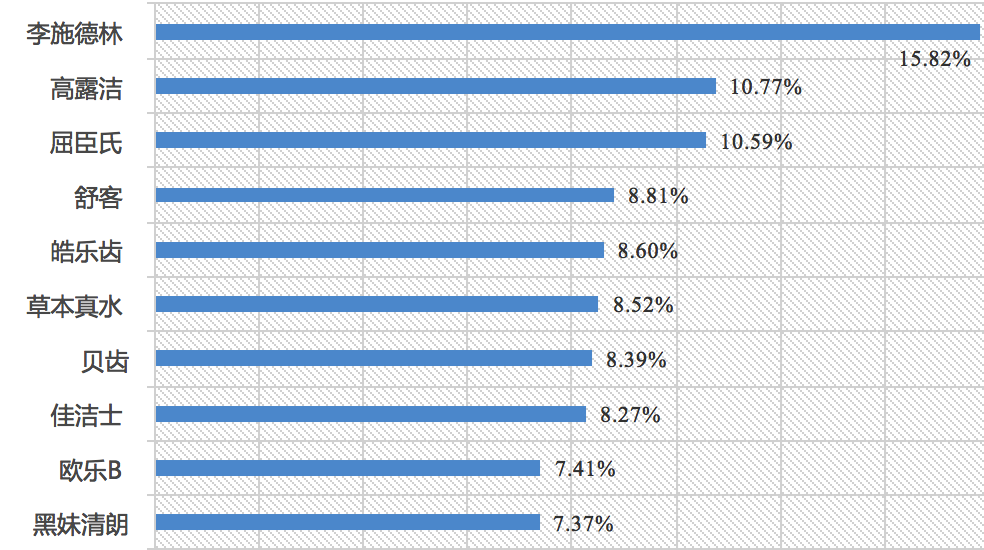 上图:2016年消费者对各类漱口水品牌从认知到购买转化率Top10(%)