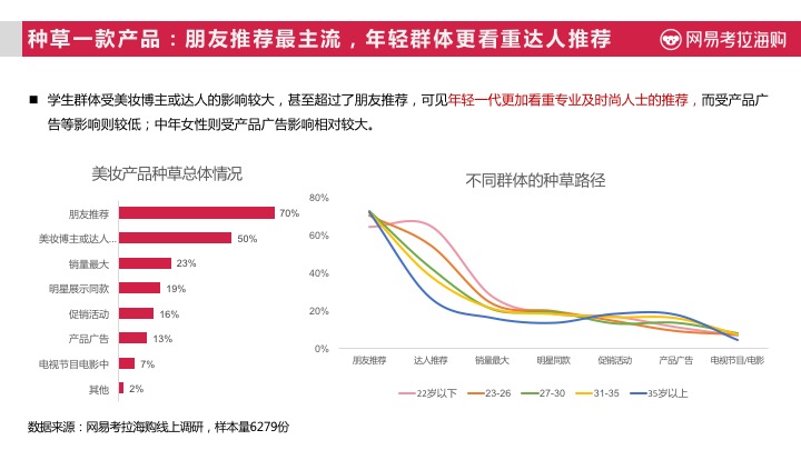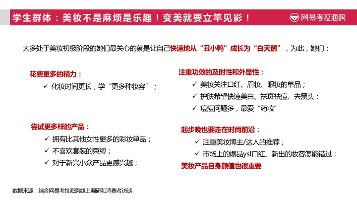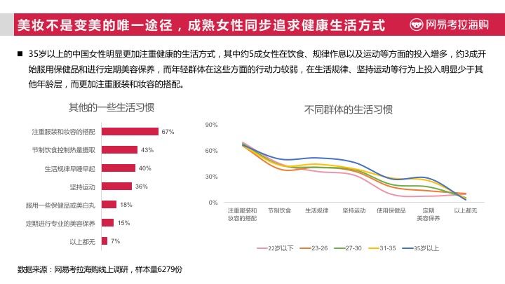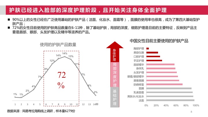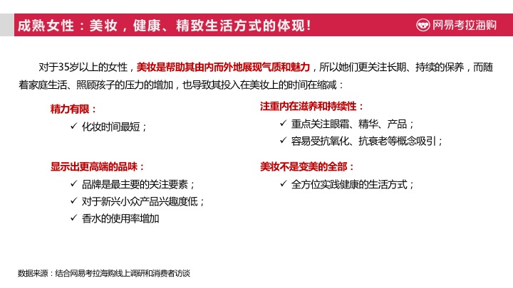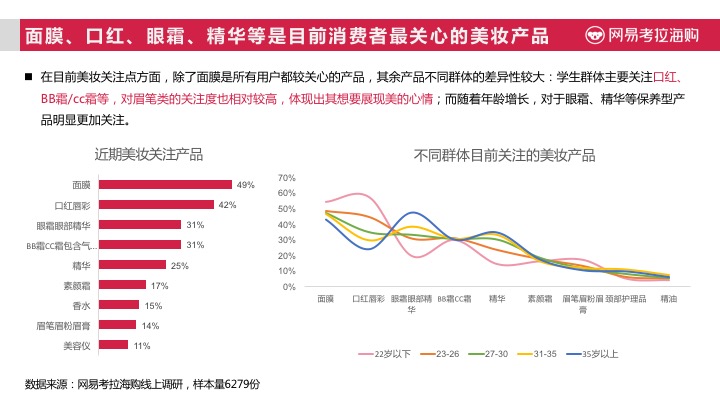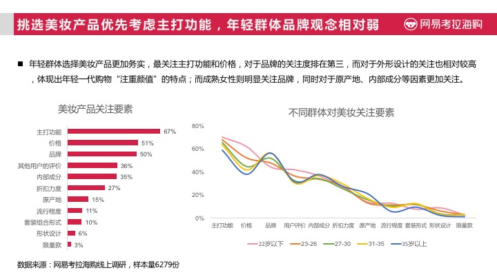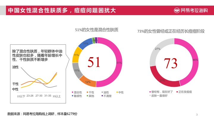 根据网易考拉海购《2017进口美妆趋势报告》》显示,中国女性半数为混合型肤质,而在年轻群体中油性皮肤也较多,随着年龄增长中性、干性肤质不断增多,将近有7成以上女性消费者曾经或正在经历长痘痘阶段。这也导致了中国女性消费者,在对美妆类商品的选择时,更注重其功效成分。