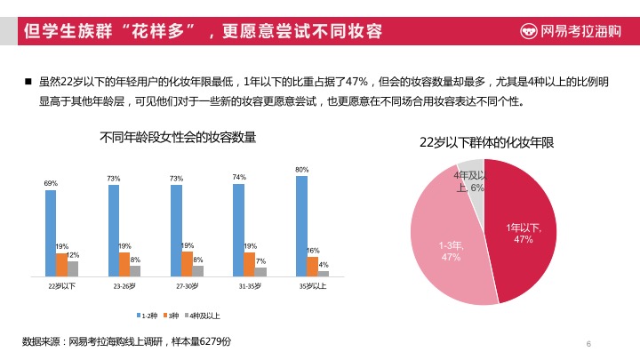 但得益于中国美妆达人与博主的影响,中国学生群体在彩妆上展现出较高的兴趣度,口红、眉笔、隔离、化妆工具、眼影、遮瑕等多方面产品有较高的使用率。虽然以学生为主的年轻用户(22岁以下)群体的化妆年限最低,但会的妆容数量却最多:化妆年限在1年以下的比重占据了47%,但会4种以上妆容的比例明显高于其他年龄层,可见他们对于一些新的妆容更愿意尝试,也更愿意在不同场合用妆容表达不同个性。