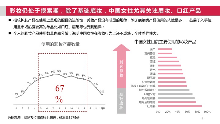 根据报告内容显示,中国将近79%的女性消费者都会化妆和护肤。但相较护肤产品在使用上呈现的醒目进阶性,美妆产品没有明显的规律;除了底妆类产品使用的人数最多,一些易于入手使用且市场热度较高的单品比如口红、眉笔等也受到追捧;而在个人的彩妆产品的使用数量上,也呈现较为分散的特征,这也说明中国女性在彩妆行为上还不成熟,个体差异性大。