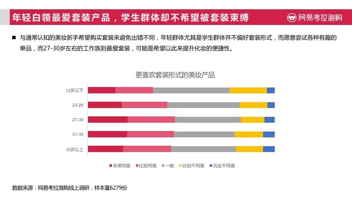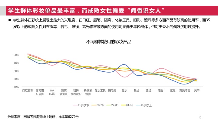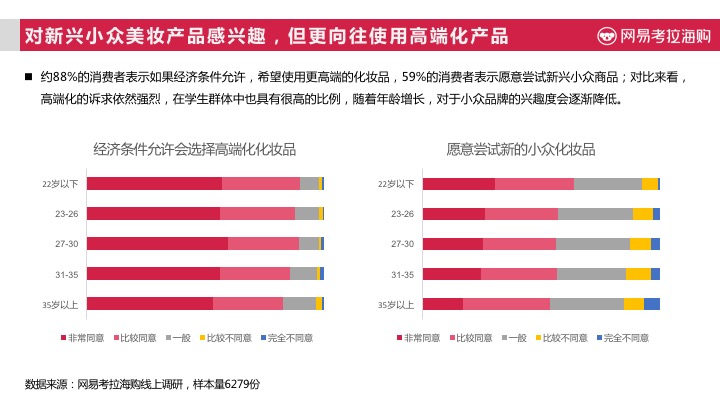 与消费现状形成强烈反差的是,88%的中国女性消费者在经济条件允许的情况下,希望使用更高端的化妆品,59%的消费者表示愿意尝试新兴小众商品;对比来看,高端化的诉求依然强烈,在学生群体中也具有很高的比例,随着年龄增长,对于小众品牌的兴趣度会逐渐降低。
