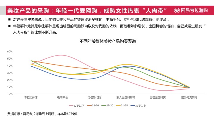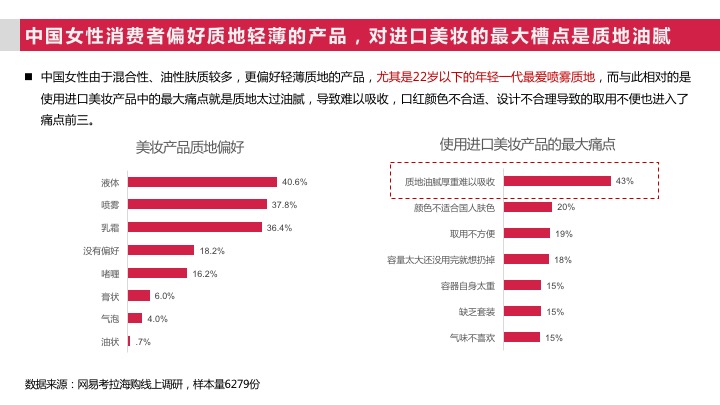 但中国女性由于混合性、油性肤质较多,更偏好轻薄质地的产品,尤其是22岁以下的年轻一代最爱喷雾质地,而与此相对的是使用进口美妆产品中的最大痛点就是质地太过油腻,导致难以吸收,口红颜色不合适、设计不合理导致的取用不便也进入了痛点前三。对于中国庞大的,深具潜力的女性进口美妆市场来说,海外美妆品牌需要根据中国女性市场的本地需求,推出针对当地消费人群的新产品,或许将成为市场的新突破点。