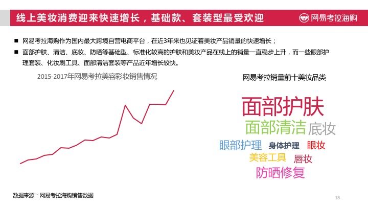 近日,网易考拉海购发布《2017进口美妆趋势报告》。网易考拉海购作为国内最大跨境自营电商平台,在近3年来也见证着美妆产品销量的快速增长;面部护肤、清洁、底妆、防晒等基础型、标准化较高的护肤和美妆产品在线上的销量一直稳步上升,而一些眼部护理套装、化妆刷工具、面部清洁套装等产品近年增长较快。