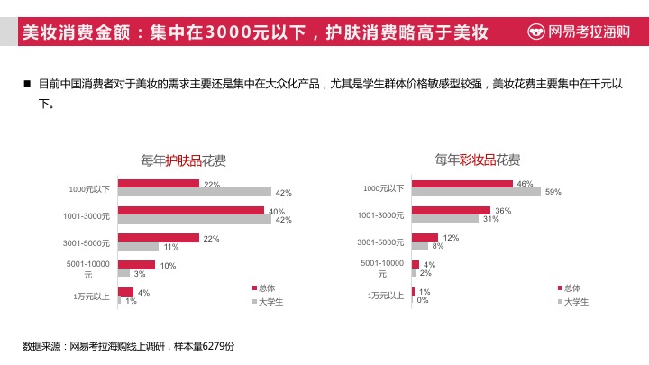 但爱“花样多”的学生群体,对于美妆产品的价格仍然较为敏感,美妆花费主要集中在千元以下,她们在选择美妆产品更加务实,最关注主打功能和价格,对于品牌的关注度排在第三,而对于外形设计的关注也相对较高,体现出年轻一代购物“注重颜值”的特点;而成熟女性则明显关注品牌,同时对于原产地、内部成分等因素更加关注。