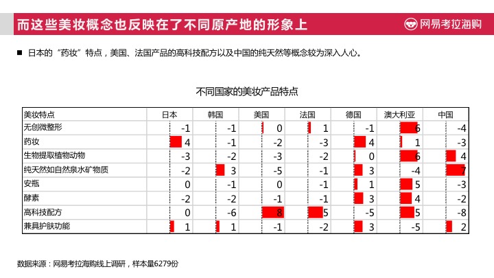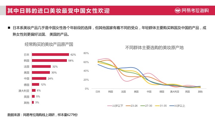受地缘优势带来的相应肤质影响,日本系美妆产品几乎是中国女性各个年龄段的选择。但其他国家也有着不同的受众,年轻群体主要购买韩国及中国的产品,成熟女性则更偏好法国、 美国的产品。对于不同原产地的跨境美妆商品,中国消费者对于不同国家美妆产品的特点也了然于心,日本的“药妆”、美国、法国产品的高科技配方以及中国的纯天然等概念较为深入人心。