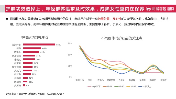 以护肤类商品为例,滋润补水作为最基础的功效得到所有用户的关注,年轻用户对于一些效果外显、及时性的功能更加关注,比如美白、祛斑祛痘、去黑头等等;而中年群体则对这些功能的关注明显降低,主要集中于补水、抗氧化、抗过敏等内在保养功效。