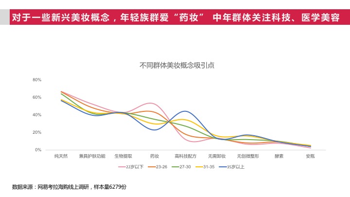 而对于一些新兴美妆概念的尝试,女性消费者也大多聚焦在功效上,并且呈现两极分化的趋势:年轻族群偏爱“药妆” 中年群体更关注科技、医学美容。