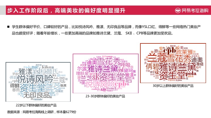从品牌选择上,不同年龄阶段的女性消费者,其对品牌的选择也存在差异,除了资生堂深受各年龄阶层女性消费者喜爱外,学生群体更偏好平价、口碑较好的产品,比如悦诗风吟、雅漾、无印良品等品牌,而像YSL口红、得鲜等一些网络热门美妆产品也颇受好评;随着年龄增长,一些更加高端的品牌如雅诗兰黛、兰蔻、 SKII 、CPB等品牌更加受欢迎。