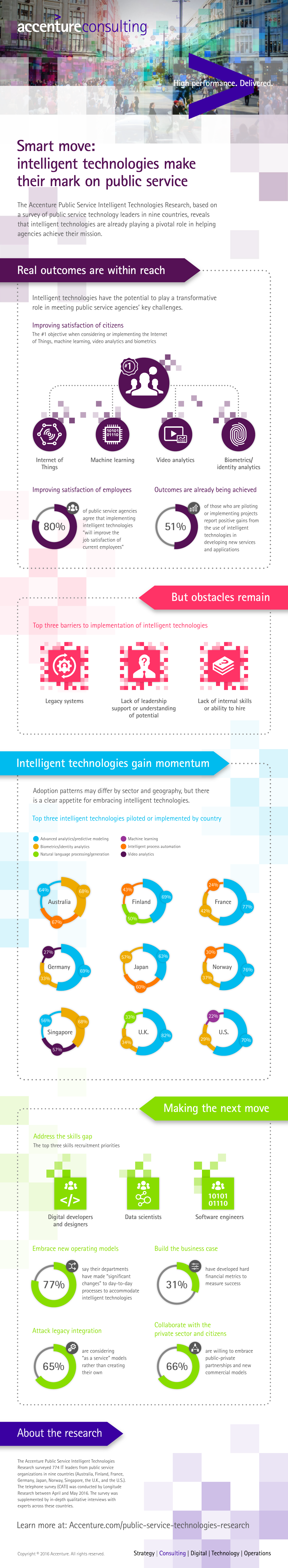作为报告的一部分,埃森哲调查了北美、欧洲和亚太地区9个国家的近800名公共服务技术人员,以及正在实施或试点的新兴技术,包括高级分析、预测建模、物联网、自动化、视频分析、生物识别、机器学习和自然语言处理等。