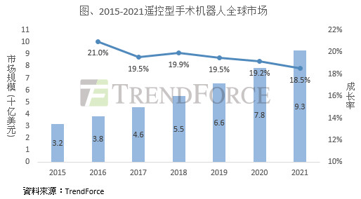 手术机器人近年在微创手术领域崭露头角,逐渐受到大众嘱目。全球市场研究机构集邦咨询最新生物科技报告《全球手术机器人市场发展趋势》指出,2016年全球遥控型手术机器人市场规模约38亿美元,2021年可成长至93亿美元,2016~2021年复合成长率(CAGR)高达19.3%,成长表现在众多医疗器材类别市场中相当突出。其中,美国为最大市场,也是使用手术机器人执行手术比例最高的地方,其次为欧洲、亚洲以及其他地区。