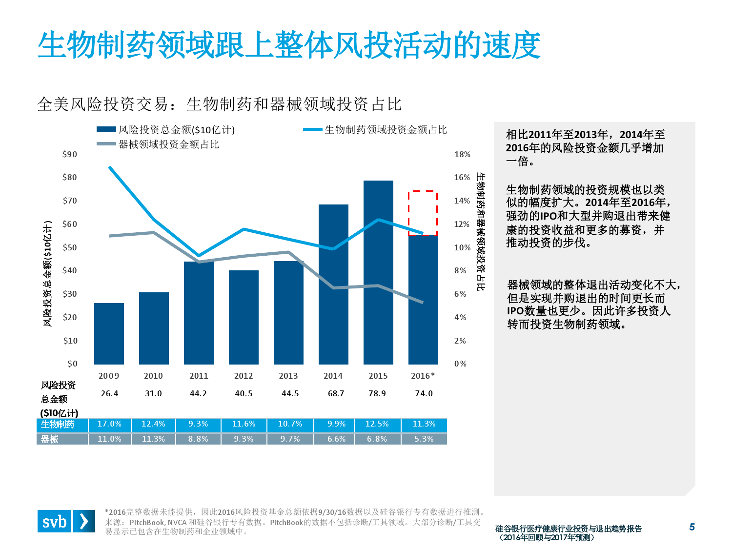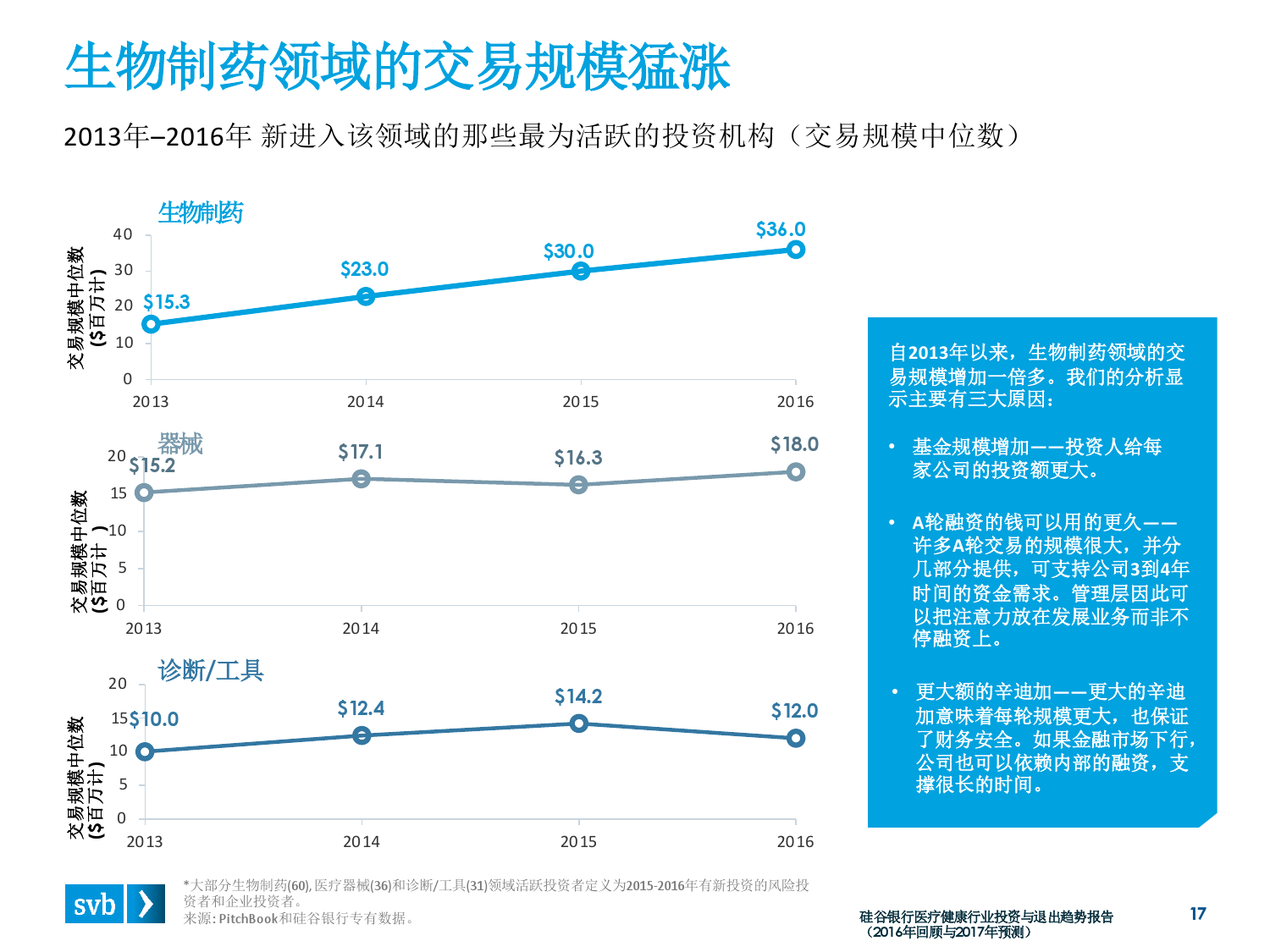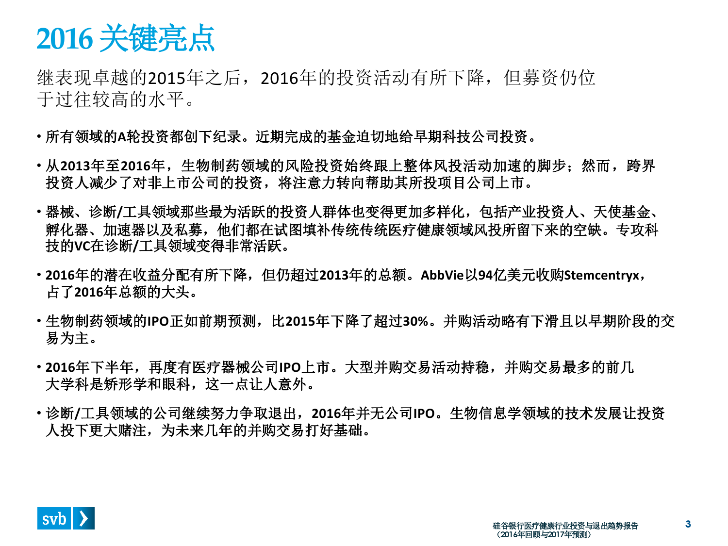 2017年初,硅谷银行发布《医疗健康行业投资与退出趋势报告(2016年回顾与2017年预测)》,继表现卓越的2015年之后,2016年的投资活动有所下降,但募资仍位于过往较高的水平。