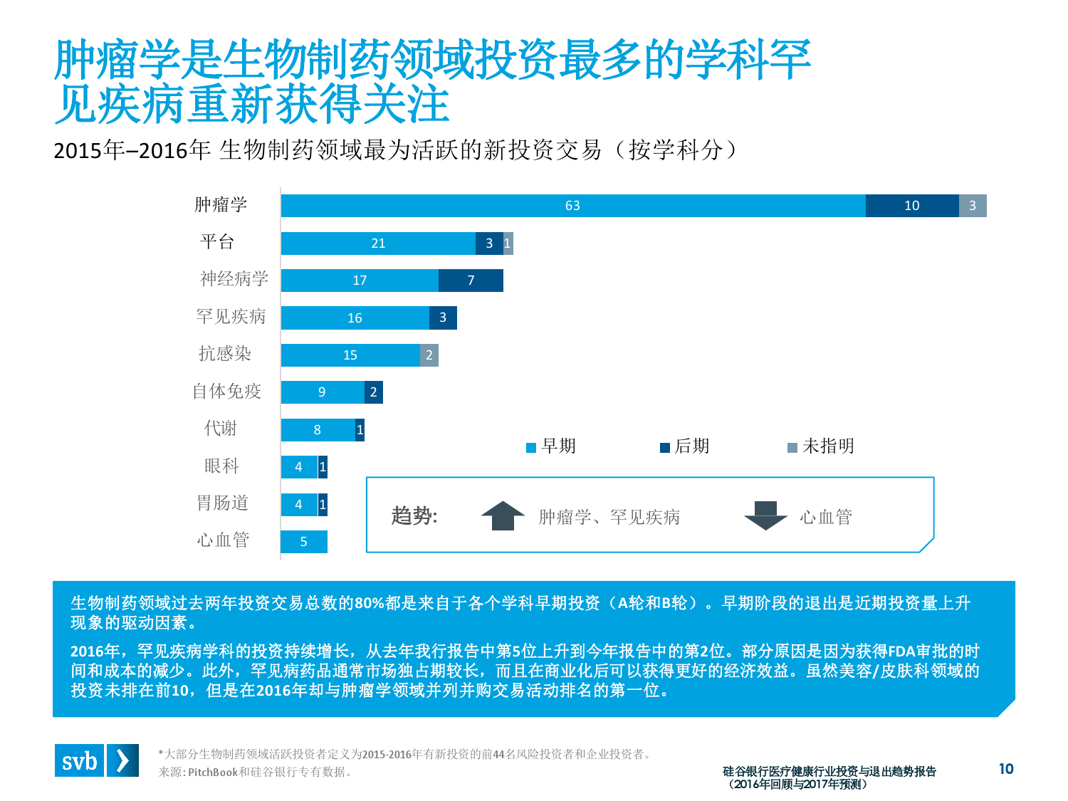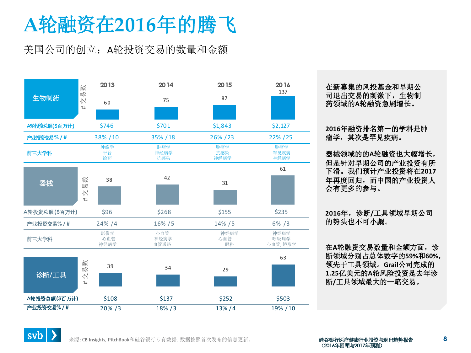 继表现强劲的2016年之后,由于资金会将注意力转移到支持未能上市的B轮和最后一轮融资的公司,因此生物制药领域的A轮投资可能将降低。器械和诊断/工具很可能会保持稳定。