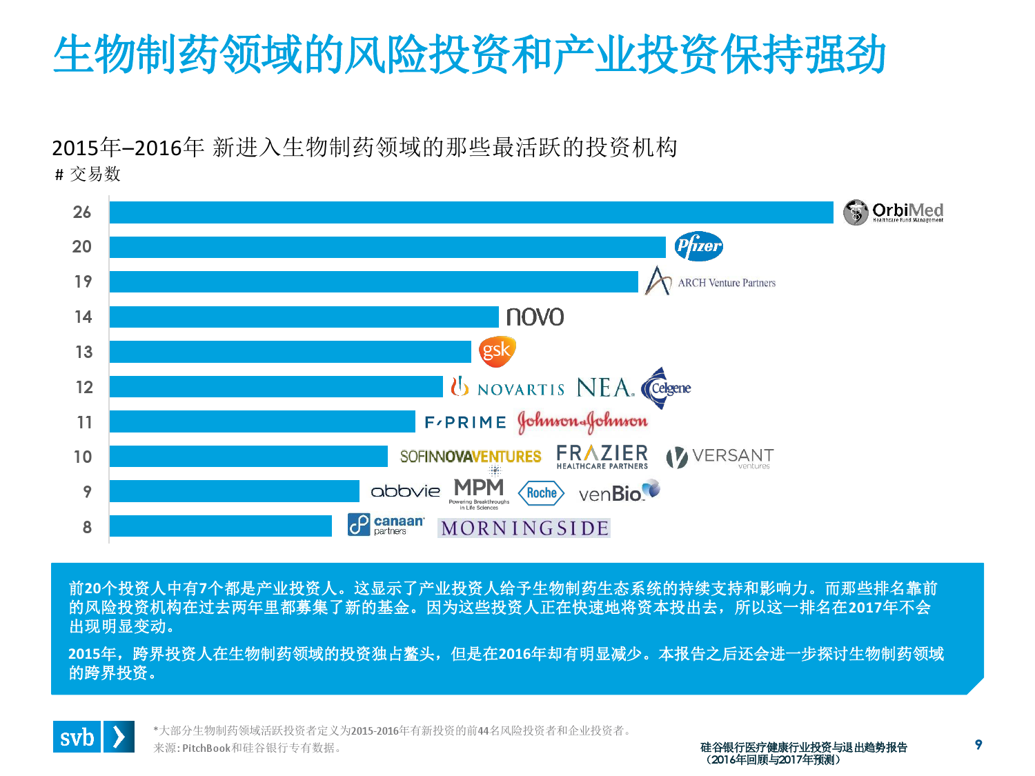 医疗健康领域的投资将与2016年基本持平。生物制药将继续成为表现最强劲的领域。