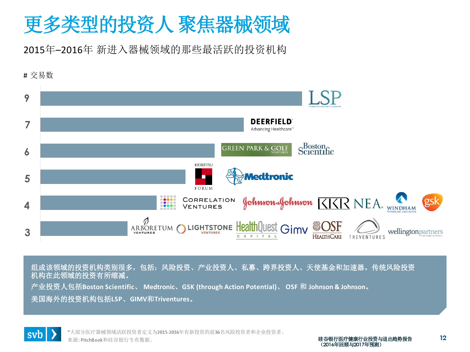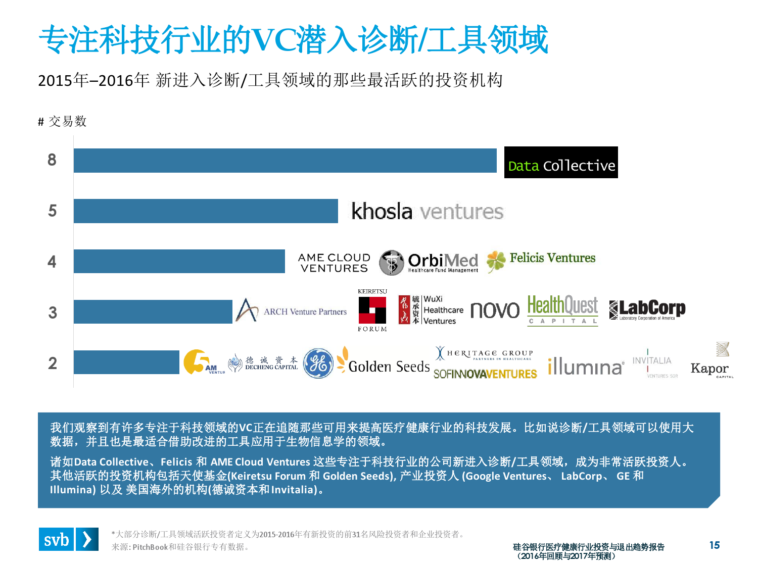 器械、诊断/工具领域那些最为活跃的投资人群体也变得更加多样化,包括产业投资人、天使基金、孵化器、加速器以及私募,他们都在试图填补传统传统医疗健康领域风投所留下来的空缺。专攻科技的VC在诊断/工具领域变得非常活跃。