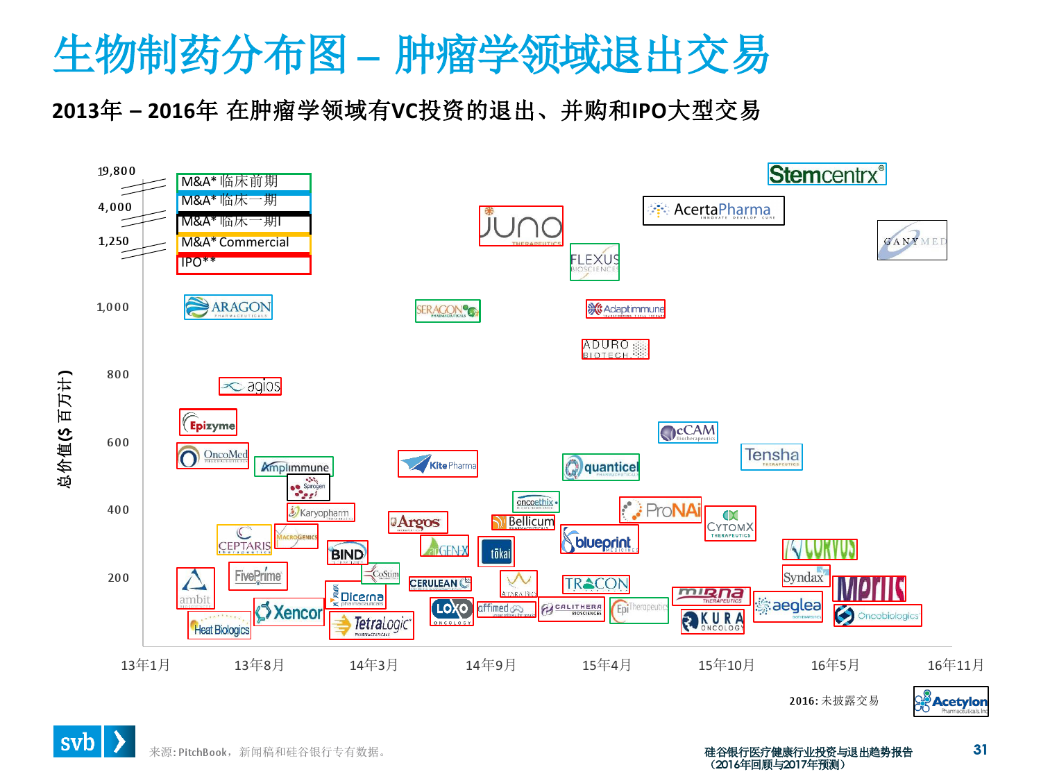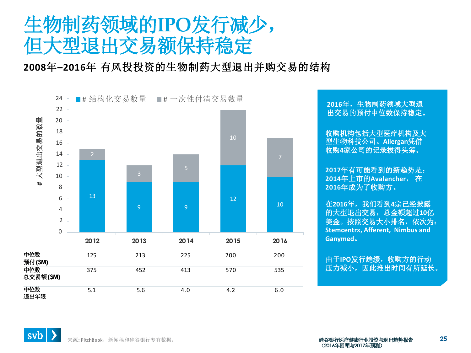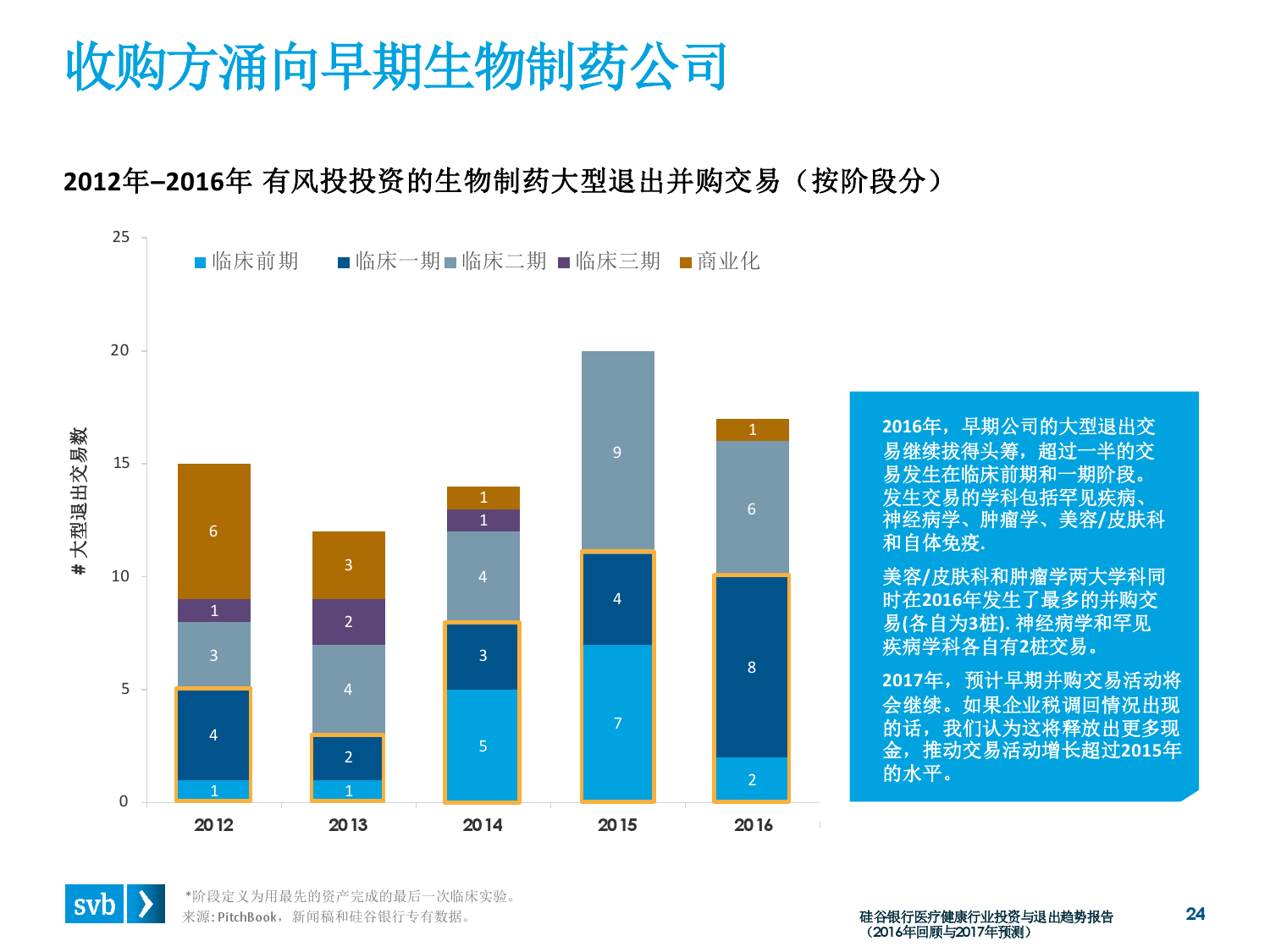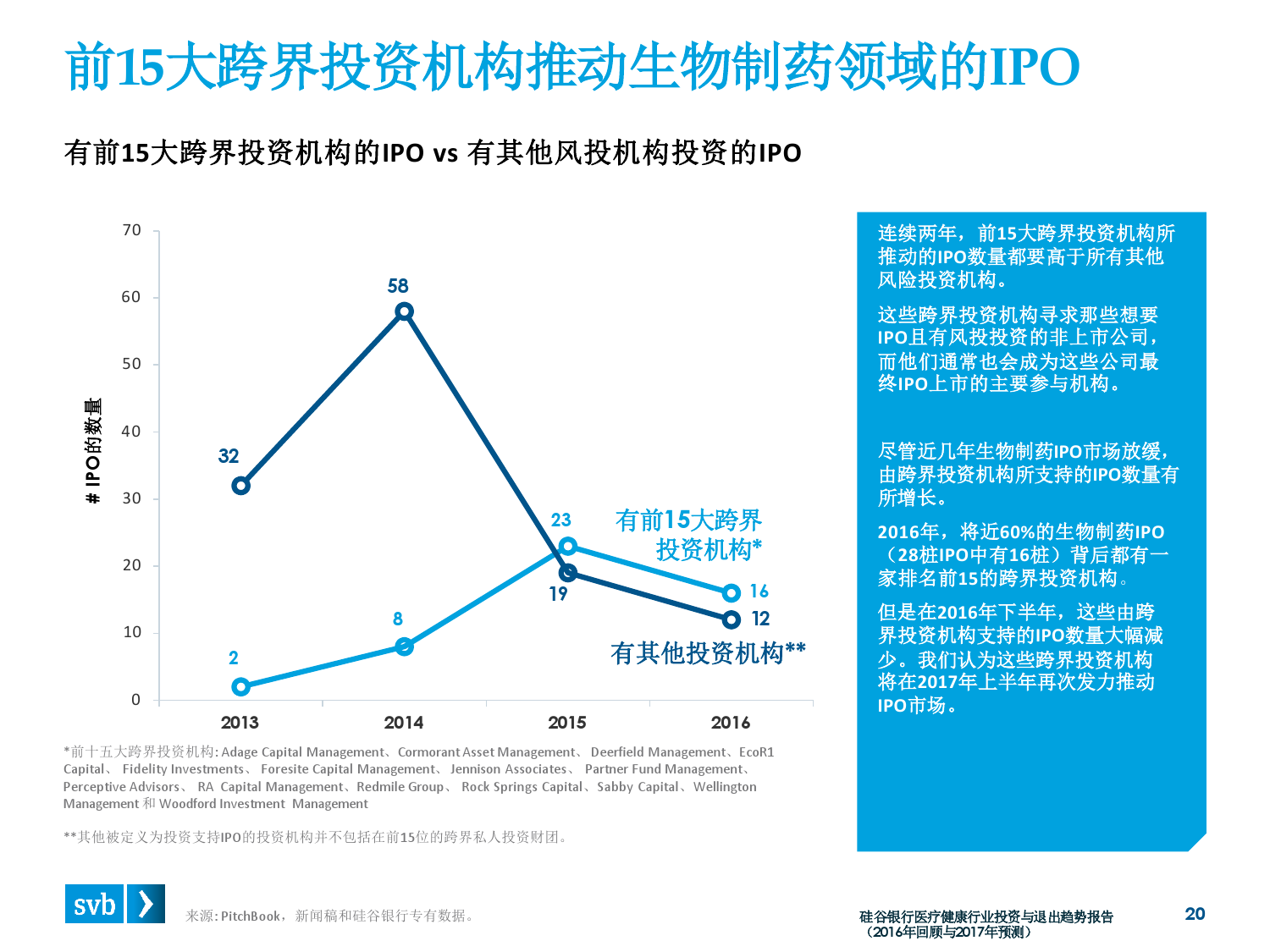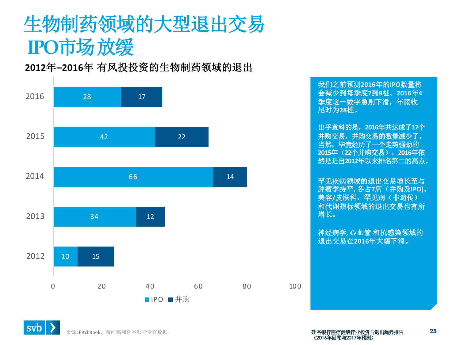 生物制药的IPO窗口在2017年将继续开放,预计迎来28至32个IPO (相较2016年的28个)。跨界者们将继续积极的推动他们的公司上市。至少50%来自生物制药领域的大型并购和退出将会是早期公司,这总数预计将达到18至22个。