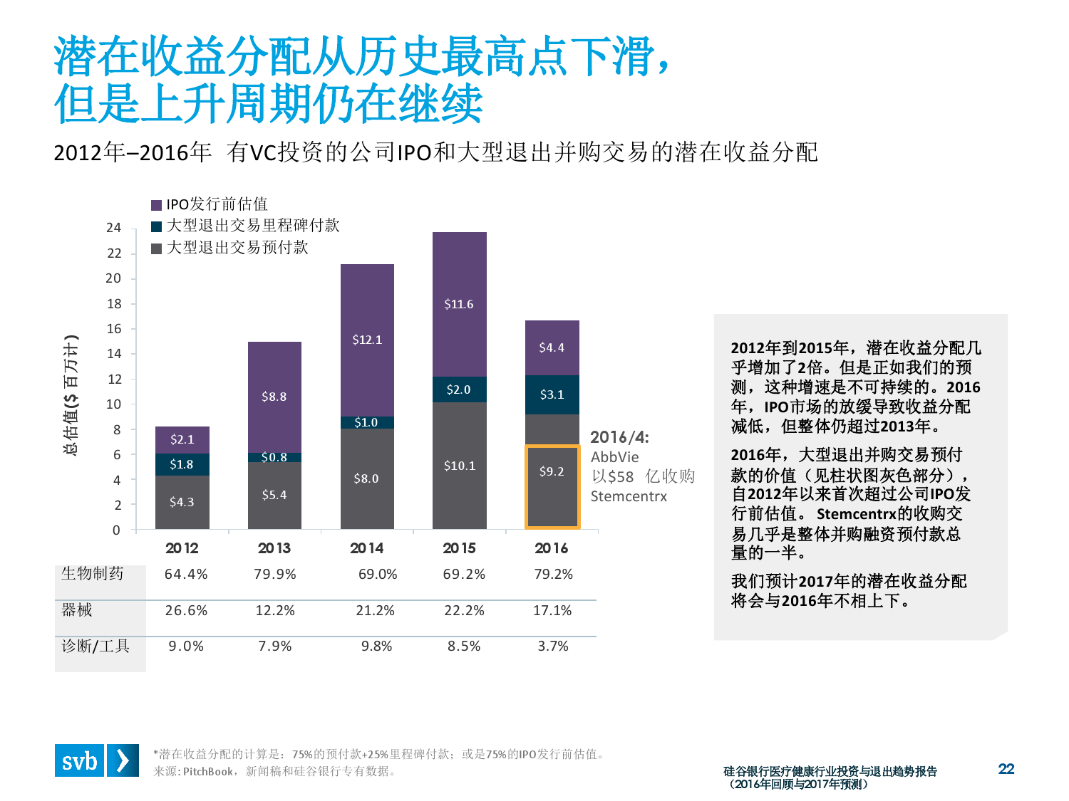 2016年的潜在收益分配有所下降,但仍超过2013年的总额。AbbVie以94亿美元收购Stemcentryx,占了2016年总额的大头。