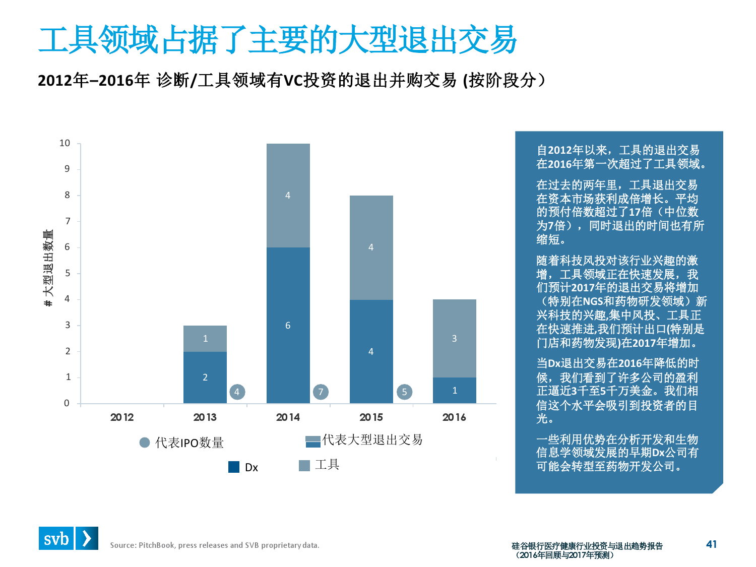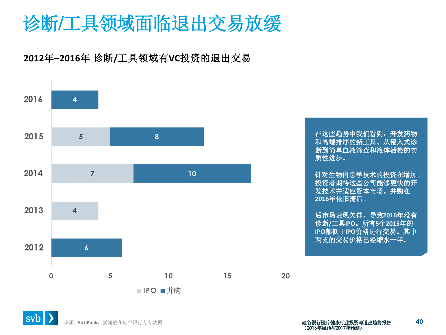 诊断/工具领域的公司继续努力争取退出,2016年并无公司IPO。生物信息学领域的技术发展让投资人投下更大赌注,为未来几年的并购交易打好基础。