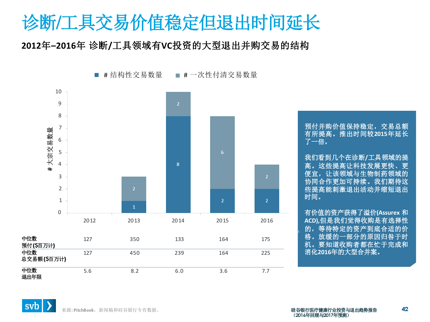 诊断/工具 行业的大型并购举措在2017年将可能达到两位数增加(2016年有4个)。我们预计将有至少一个交易金额超过10亿美金的大型收购。