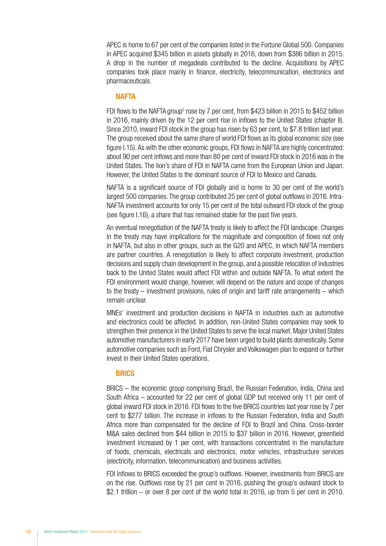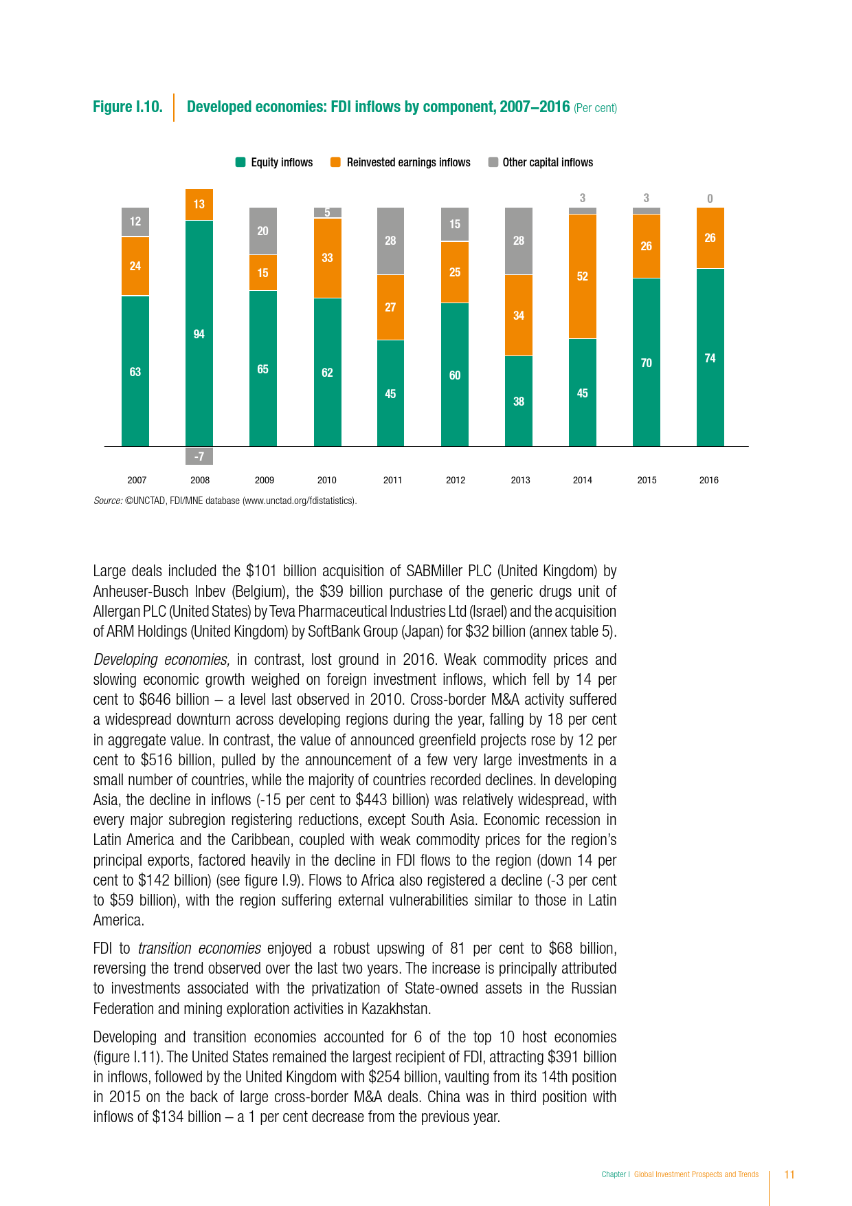 在南亚,外国直接投资流入量增加了6%,达到540亿美元。印度的流入量停滞在440亿美元。跨境并购交易对外国跨国企业寻求进入迅速增长的印度市场而言日益重要2016年有若干重大交易,包括由俄罗斯石油公司斥资130亿美元收购埃萨石油公司的股权。为支持“一带一路”倡议,中国提供了大量基础设施投资,所以巴基斯坦的流入量增加了56%。