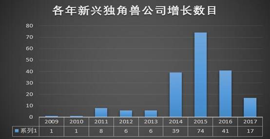 自2009年以来,新兴独角兽呈现阶段上升态势,在2015年达到顶峰,当年共出现74家独角兽公司,引得业界普遍关注。