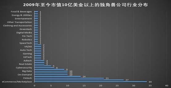 在这些独角兽公司行业分布中,电子商务门类公司最多,达到了36家之多,其中中国占据了其中14个席位。