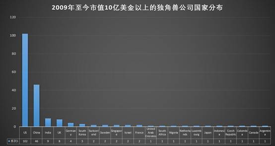 中国以46家独角兽企业紧随其后,排名第三第四的印度和英国分别只有9家和8家独角兽企业,与美国和中国相距甚远。