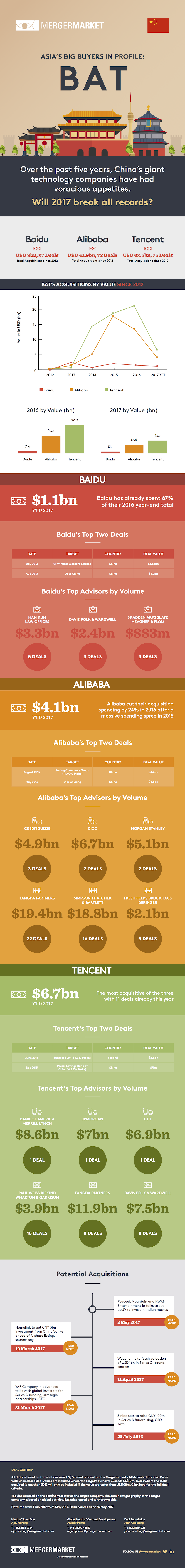 并购市场资讯Mergermaket最新发布的《亚洲大买手档案:BAT互联网三巨头》分析了百度、阿里巴巴和腾讯过去5年间的并购数据。