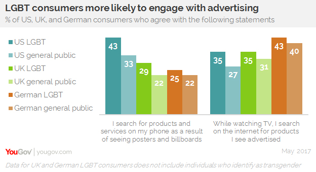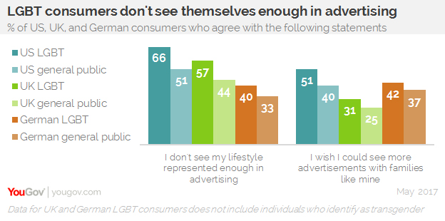 YouGov发布了2017年LGBT消费者品牌排名,英国、美国和德国的LGBT消费者希望在广告中看到更多的LGBT。