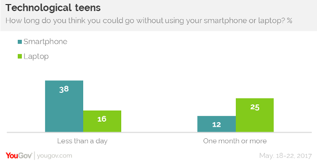 为了了解青少年对智能手机的依赖情况,YouGov调查了13-17岁青少年的手机使用情况。调查发现,超过1/3的美国青少年表示,无法离开智能手机超过一天(38%)。大部分受访青少年认为,无法坚持一周不使用智能手机(71%)。
