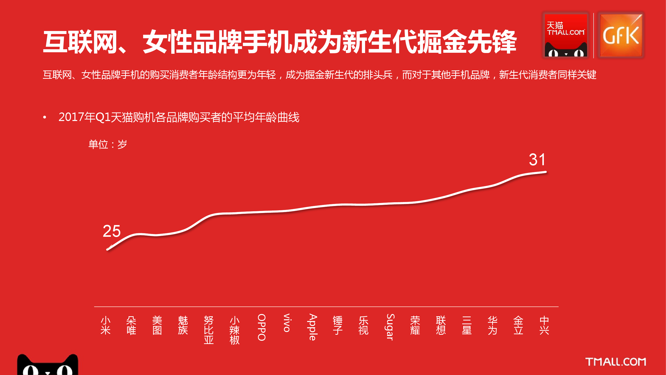 人口统计数据显示,中国人口老龄化趋势日趋明显,新生代具备强烈的消费欲望、突出的个性彰显、超前的消费理念、更高的品质追求等特质,成为手机厂商的关键掘金点,天猫手机市场天然的互联网优势,吸纳了大批新生代用户,从而推动年龄结构进一步年轻化,成为掘金新生代的关键市场。