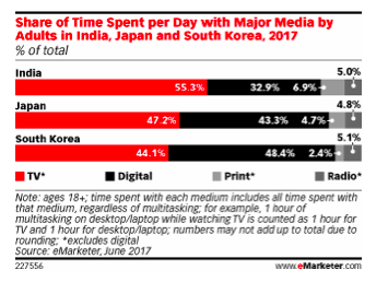 近日,eMarketer 发布数据报告称,2017 年日本成年人平均每天在数字媒体上的投入时间将达到 3 小时(3 小时 5 分钟),韩国成年人则达到 3小时 26 分钟。