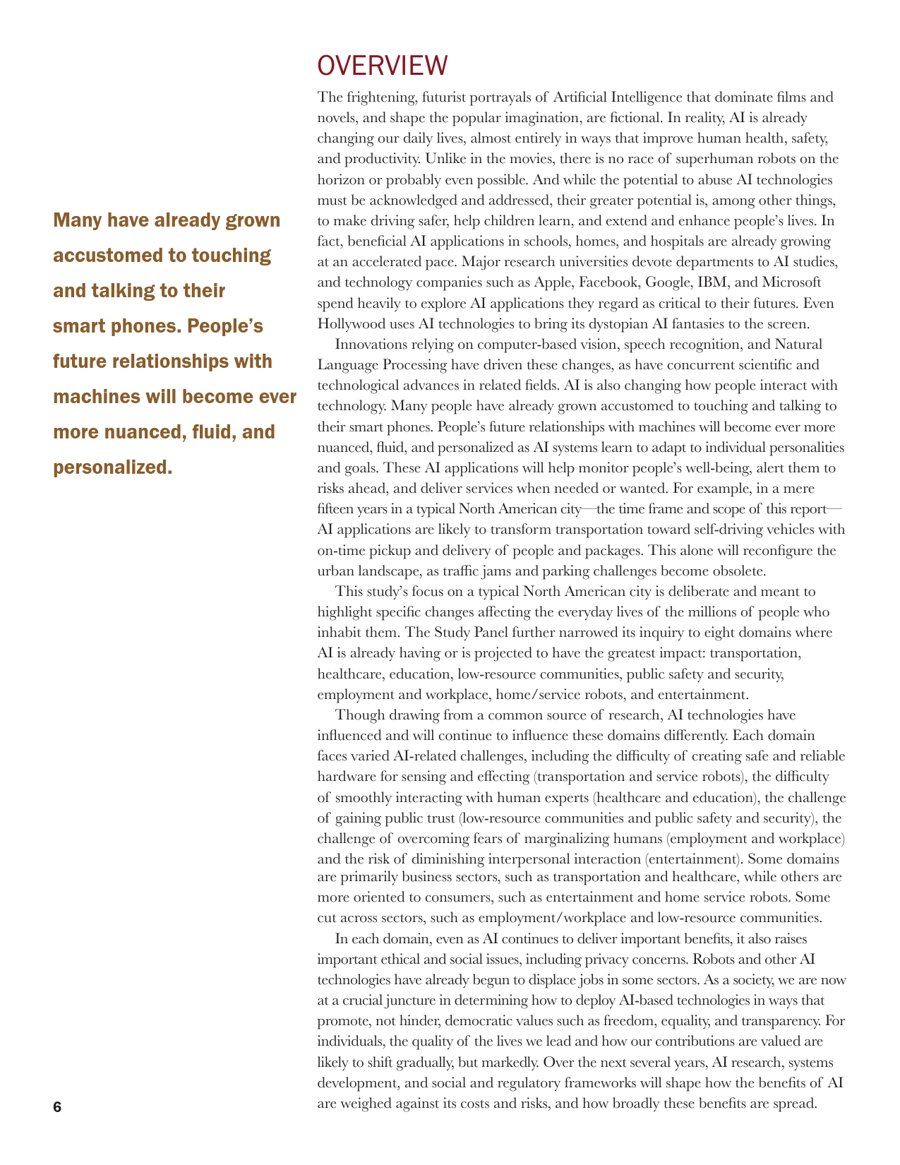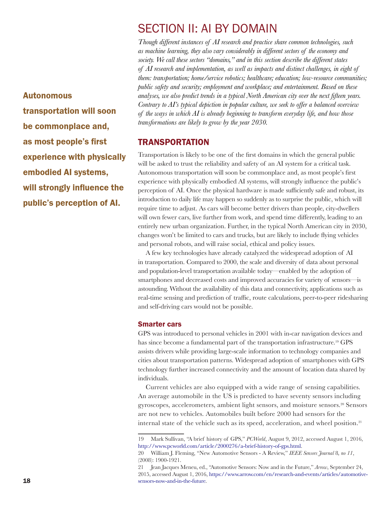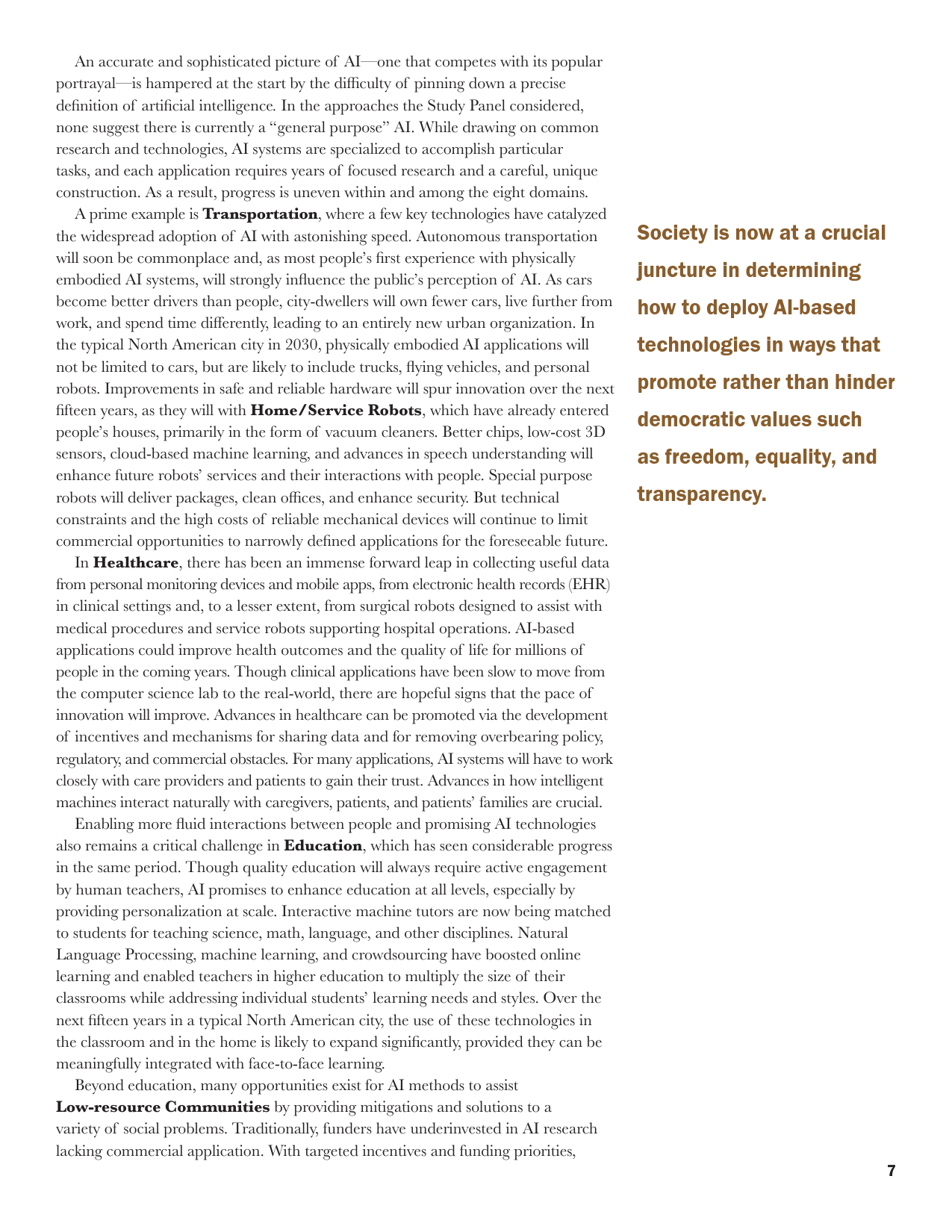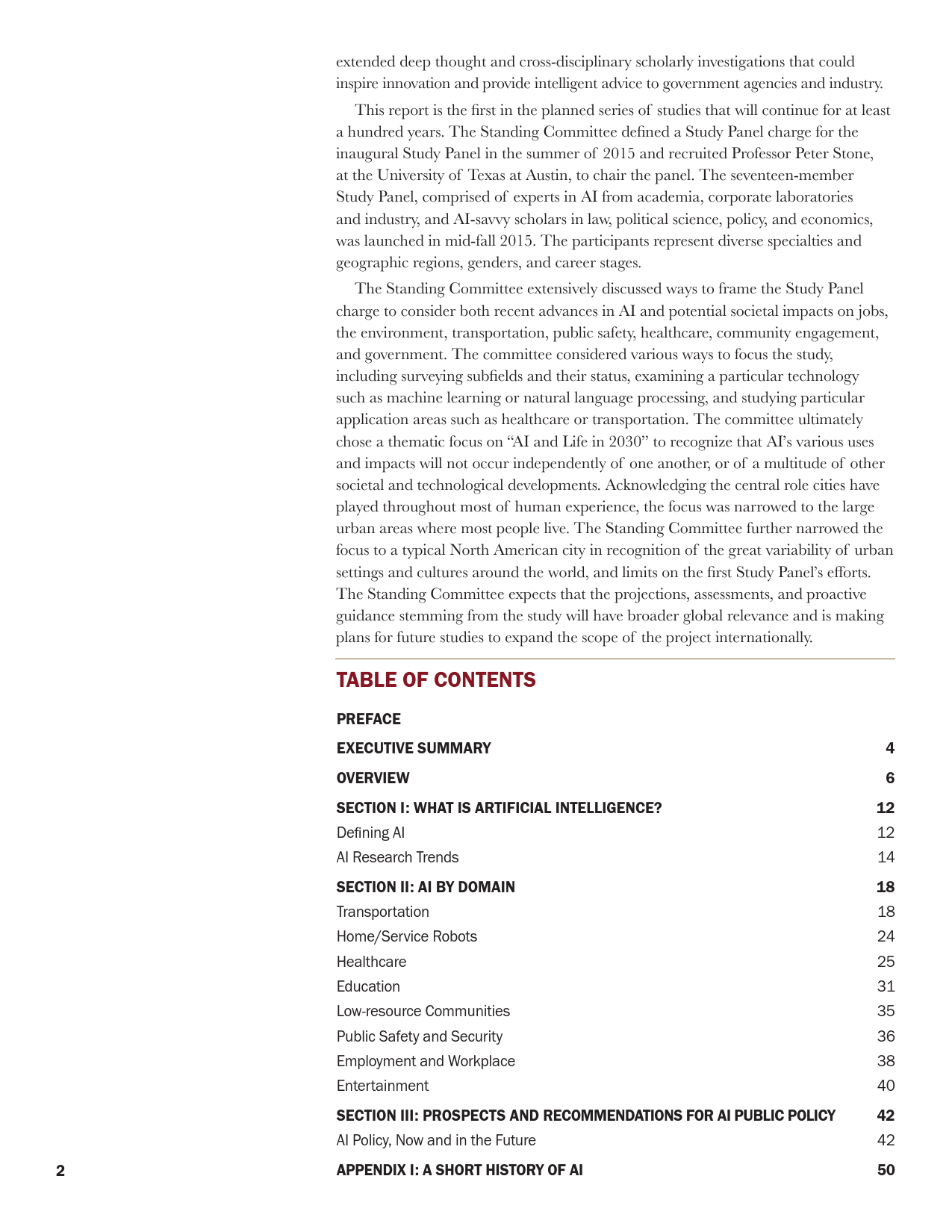 “2030年的人工智能与生活”调查了城市生活中现在已经受到人工智能巨大影响,并且在2030年会受到更大影响的八个领域:交通,家庭/服务机器人,医疗保健,教育,娱乐,贫困社区,公共安全和安保,就业和工作场所。