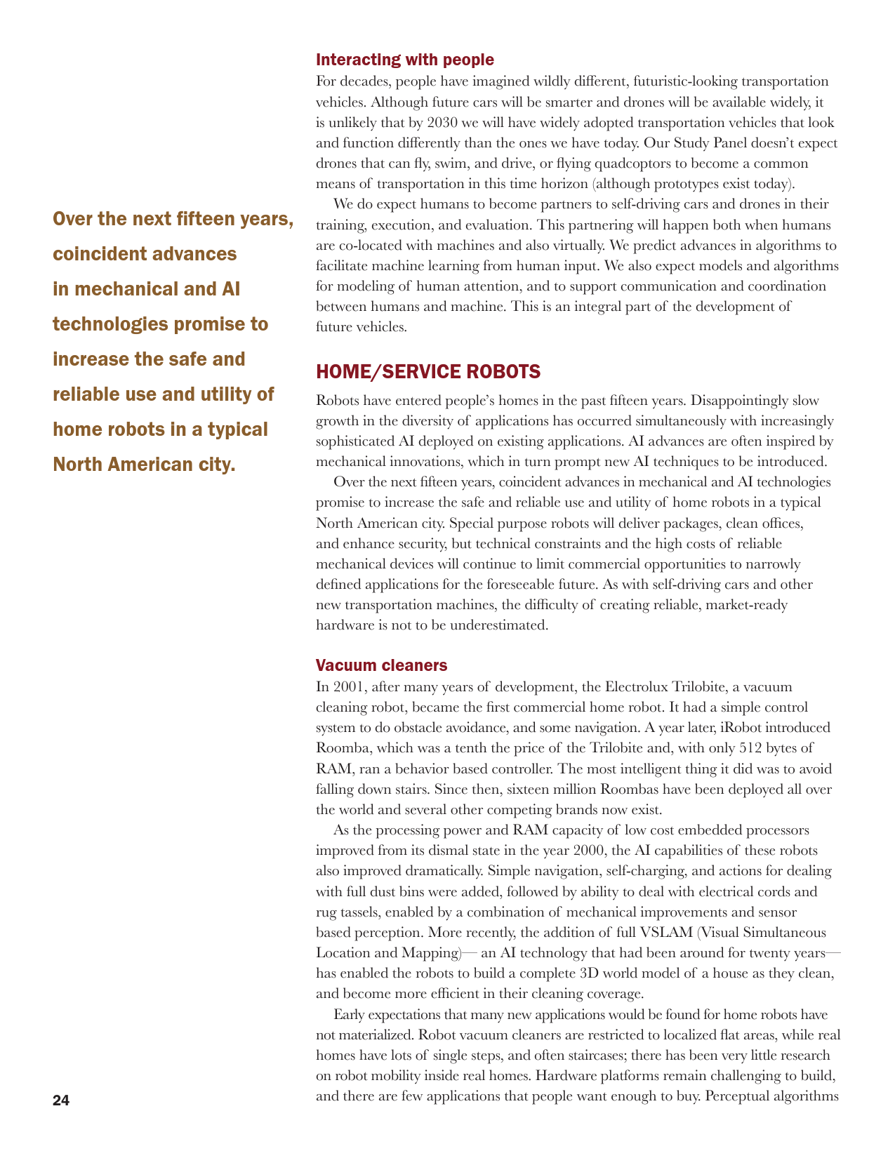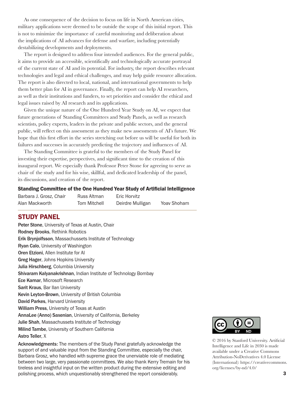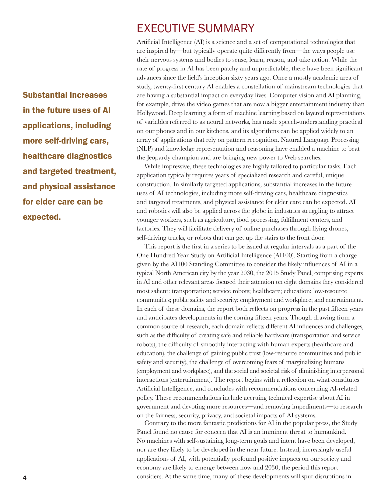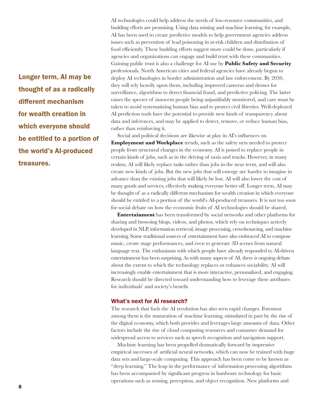 “2030年的人工智能与生活”调查了城市生活中现在已经受到人工智能巨大影响,并且在2030年会受到更大影响的八个领域:交通,家庭/服务机器人,医疗保健,教育,娱乐,贫困社区,公共安全和安保,就业和工作场所。