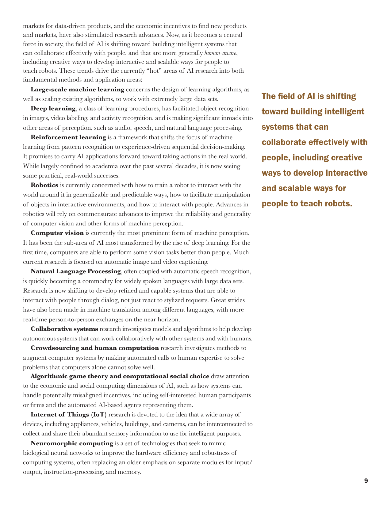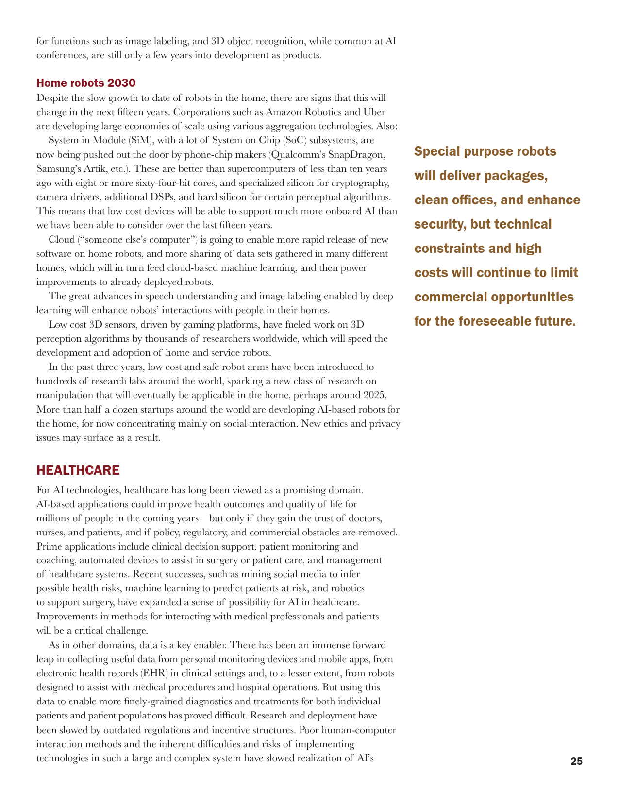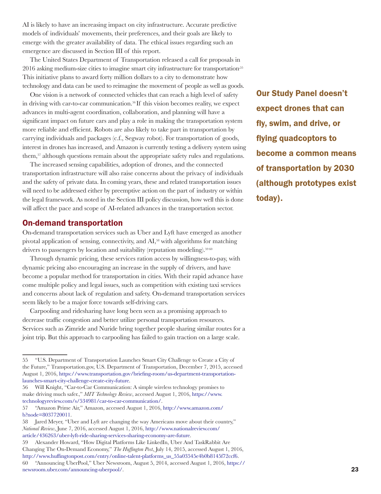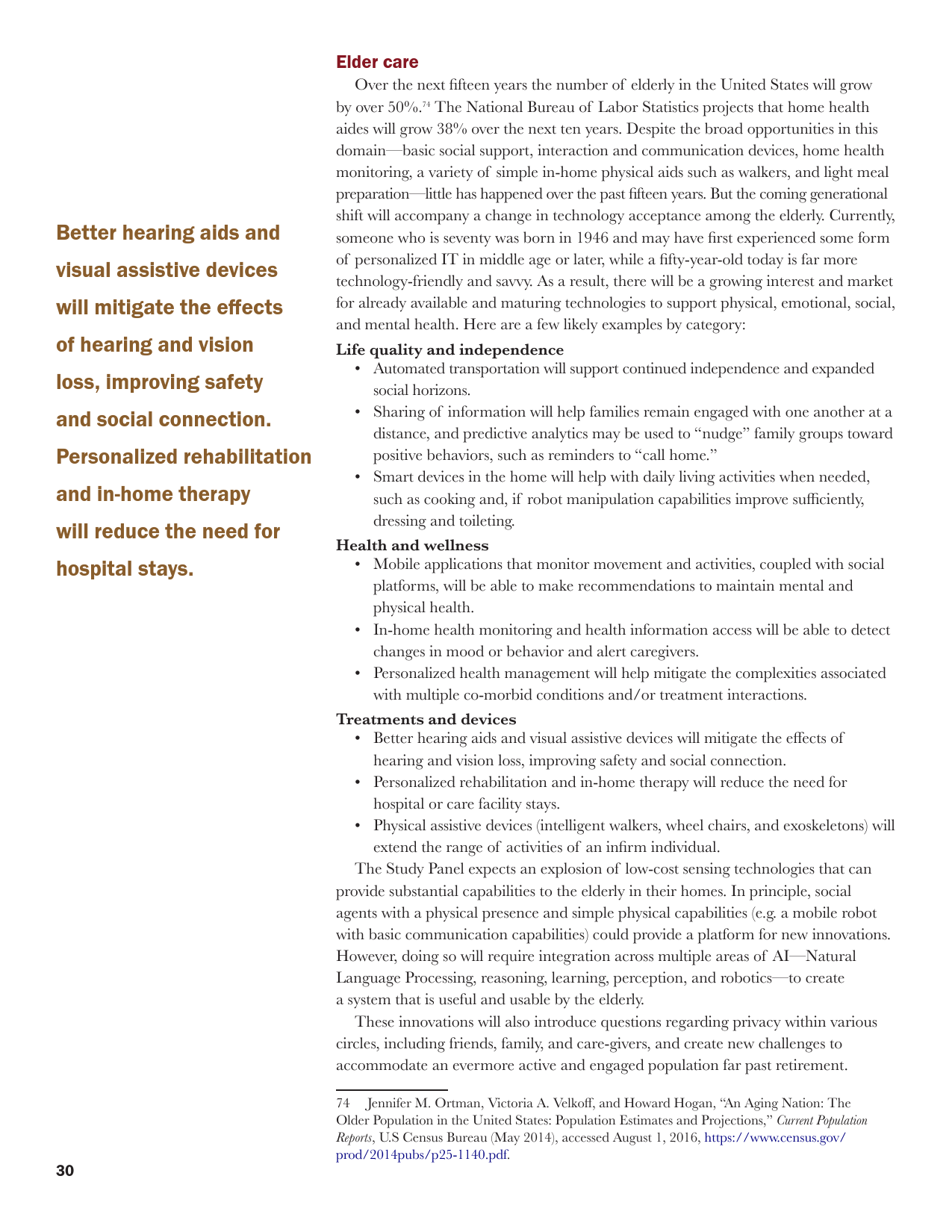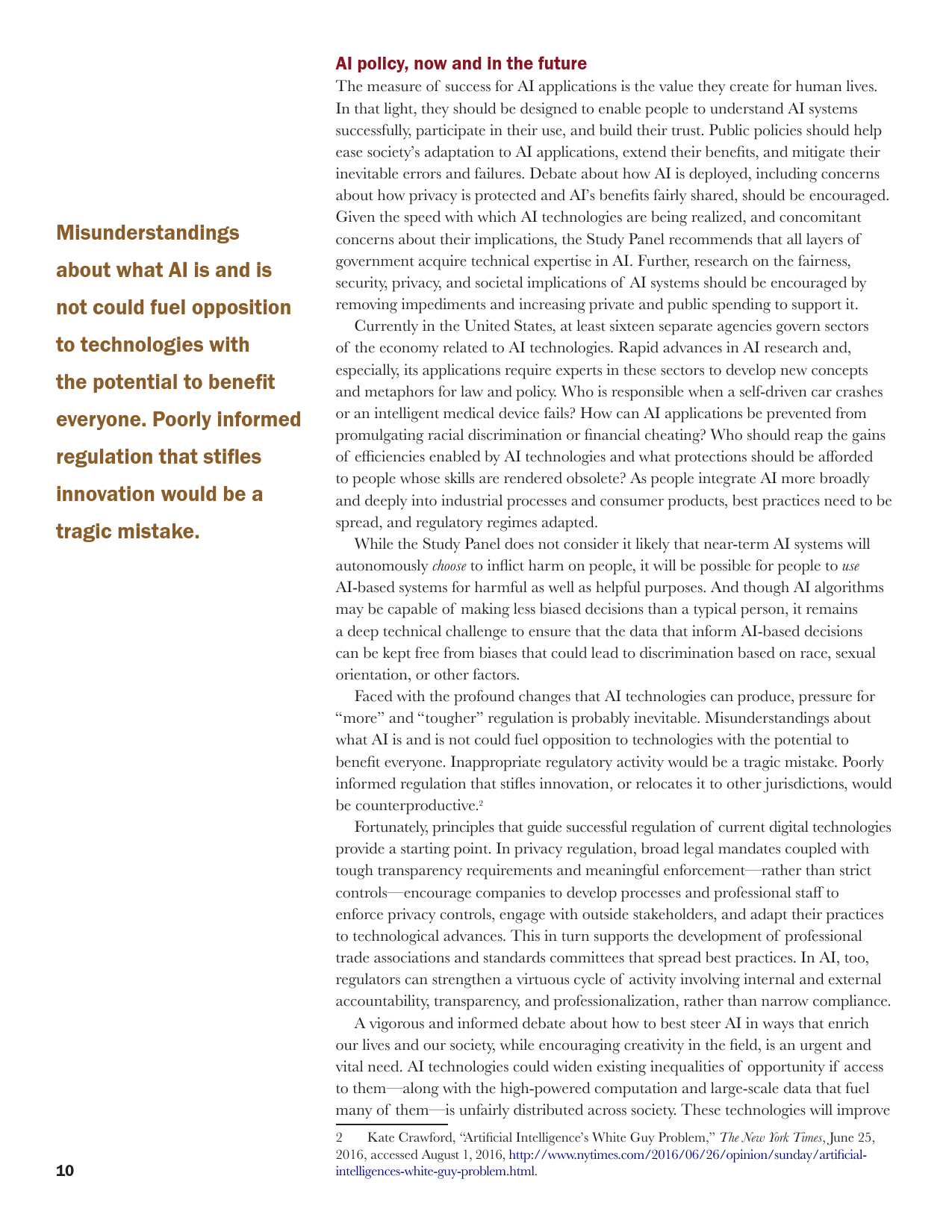 “2030年的人工智能与生活”调查了城市生活中现在已经受到人工智能巨大影响,并且在2030年会受到更大影响的八个领域:交通,家庭/服务机器人,医疗保健,教育,娱乐,贫困社区,公共安全和安保,就业和工作场所。