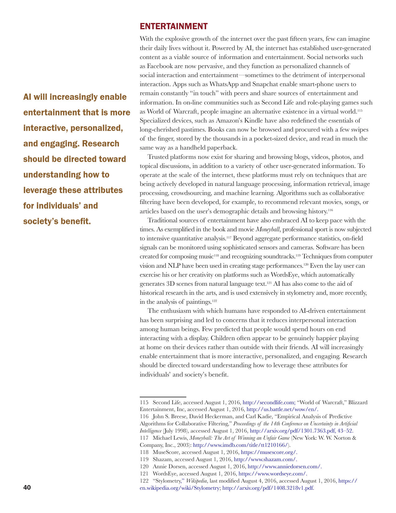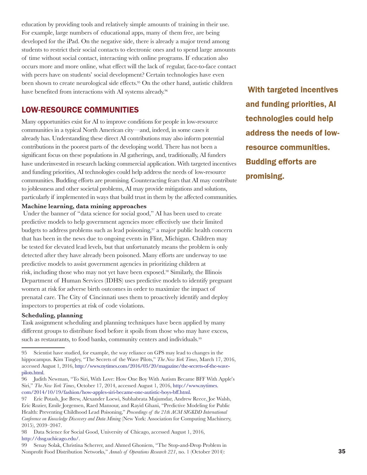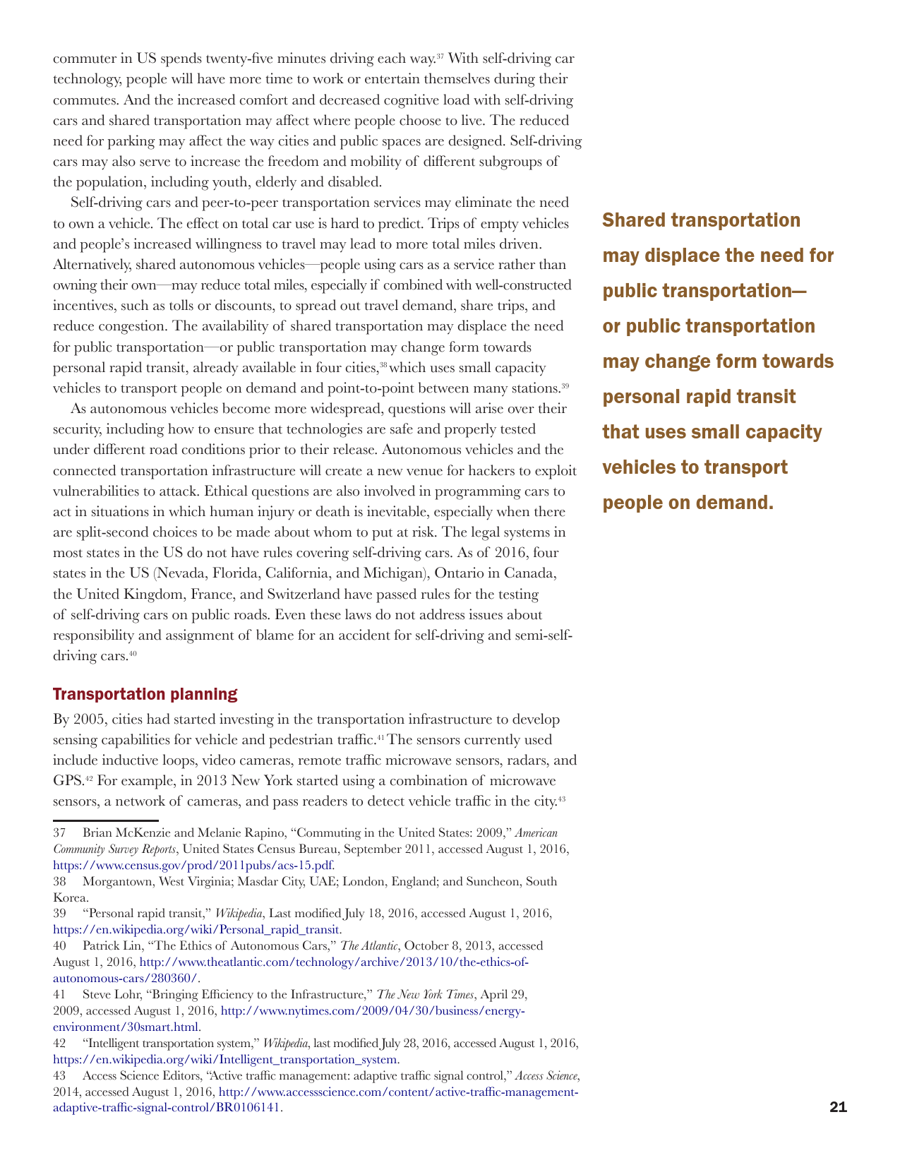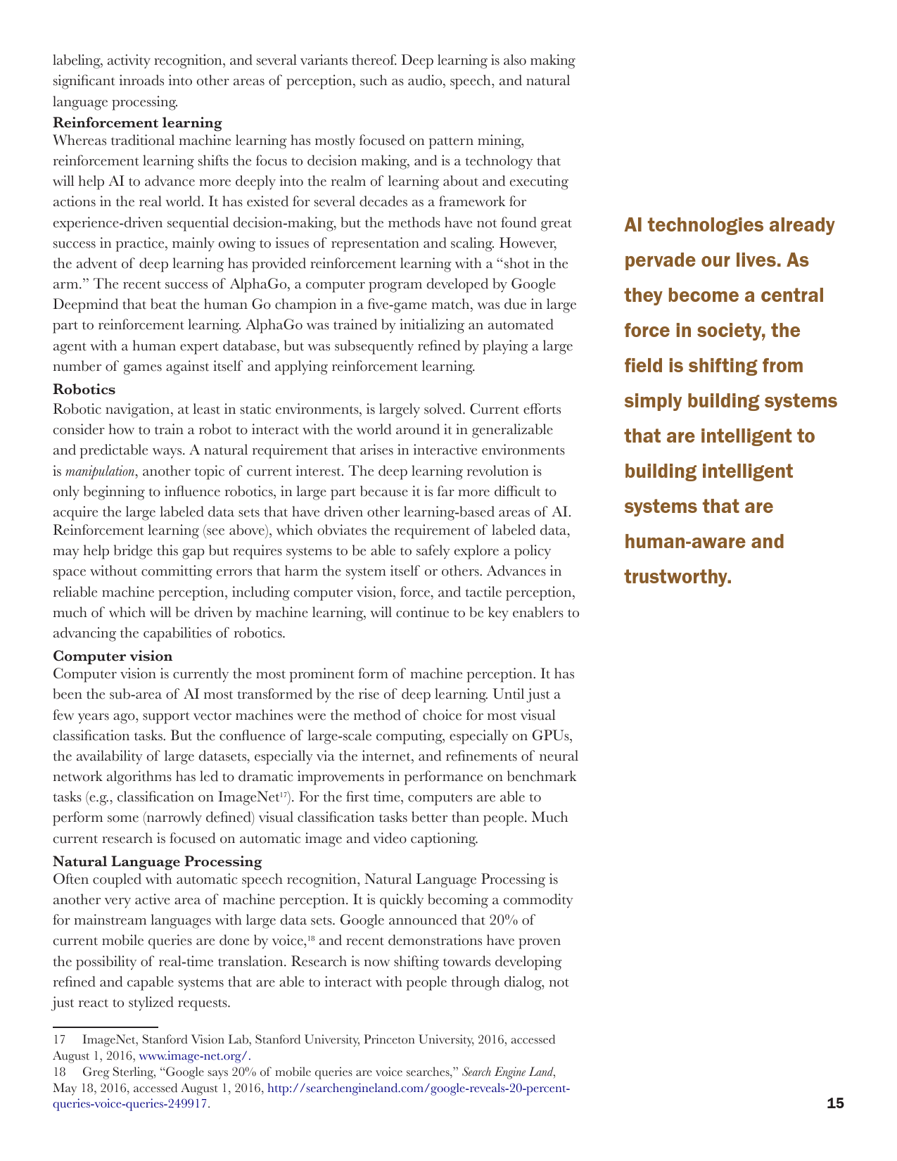 “2030年的人工智能与生活”调查了城市生活中现在已经受到人工智能巨大影响,并且在2030年会受到更大影响的八个领域:交通,家庭/服务机器人,医疗保健,教育,娱乐,贫困社区,公共安全和安保,就业和工作场所。