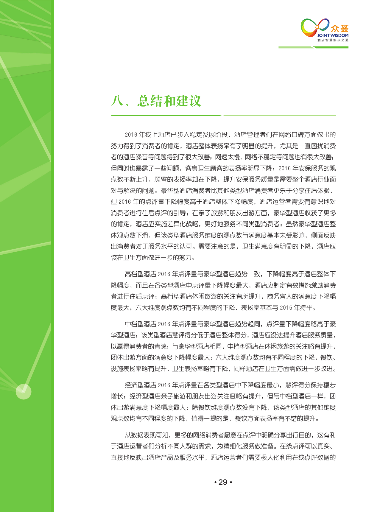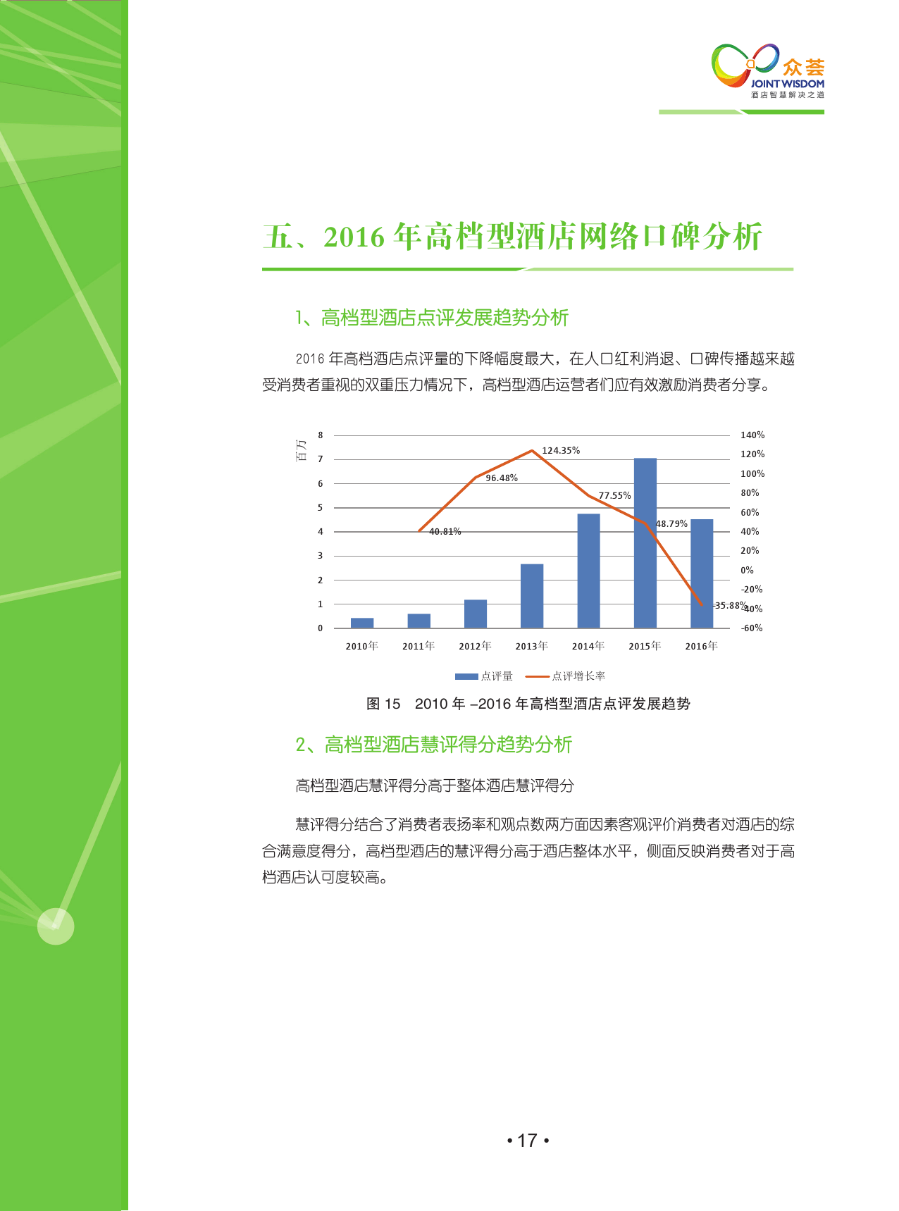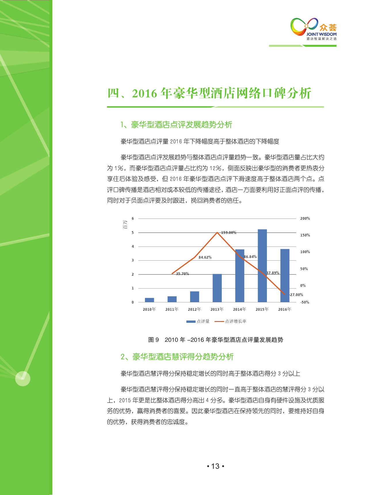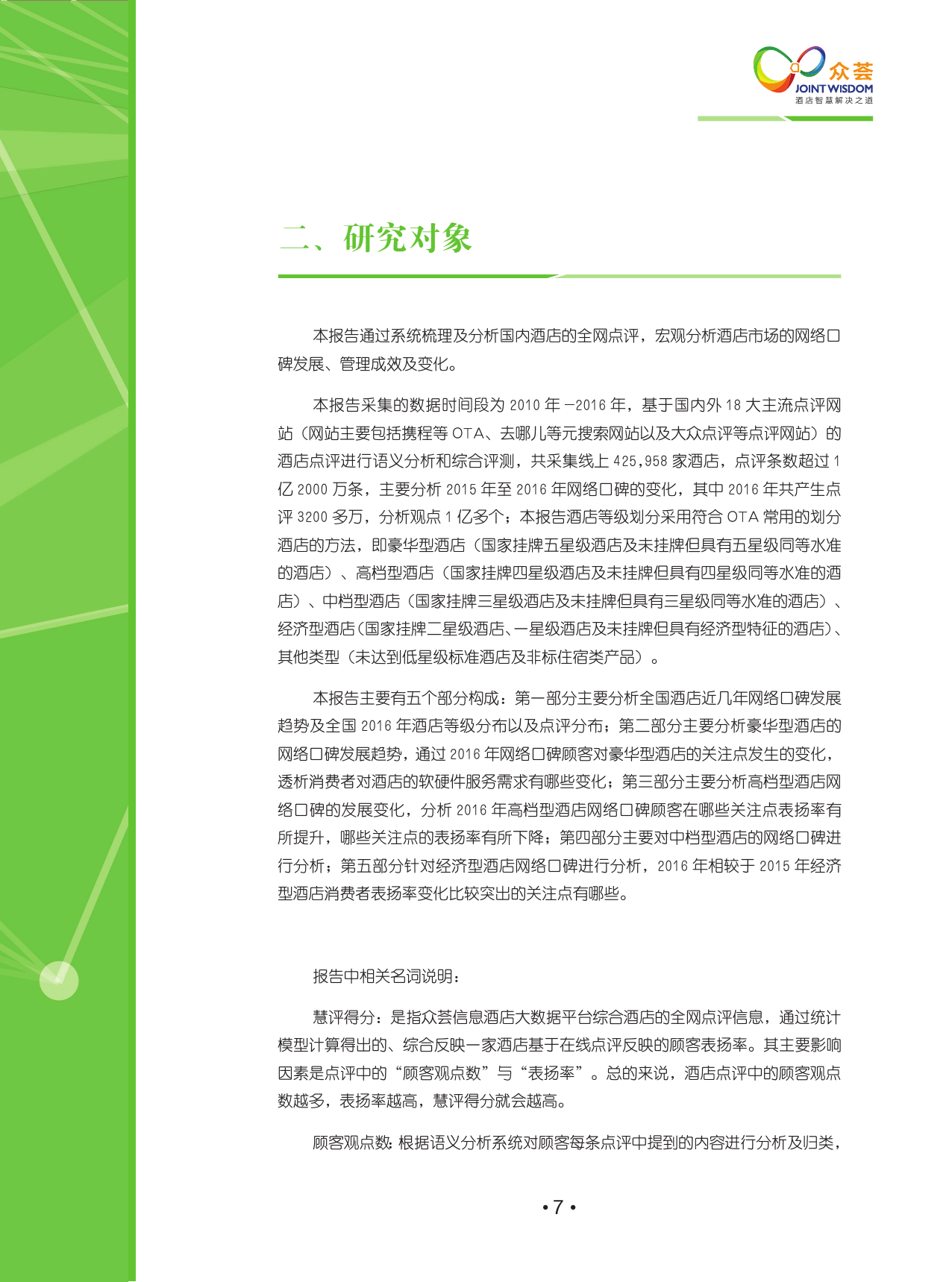 该报告涵盖了2010年-2016年国内外18大主流点评网站,包含线上425,958家酒店,超过1.2亿条点评,主要分析2015年至2016年网络口碑的变化,其中2016年共产生点评3200多万,分析观点1亿多个。