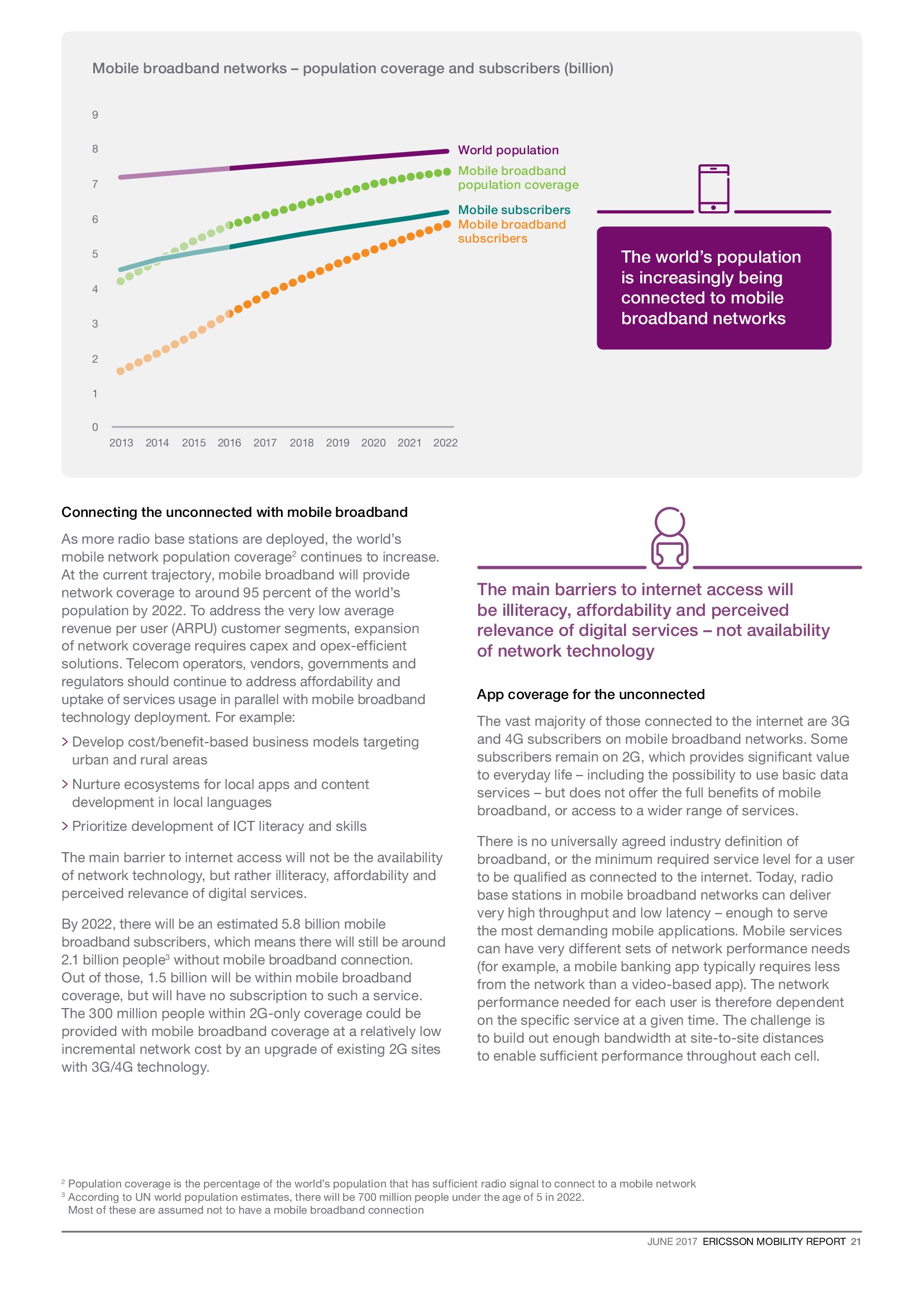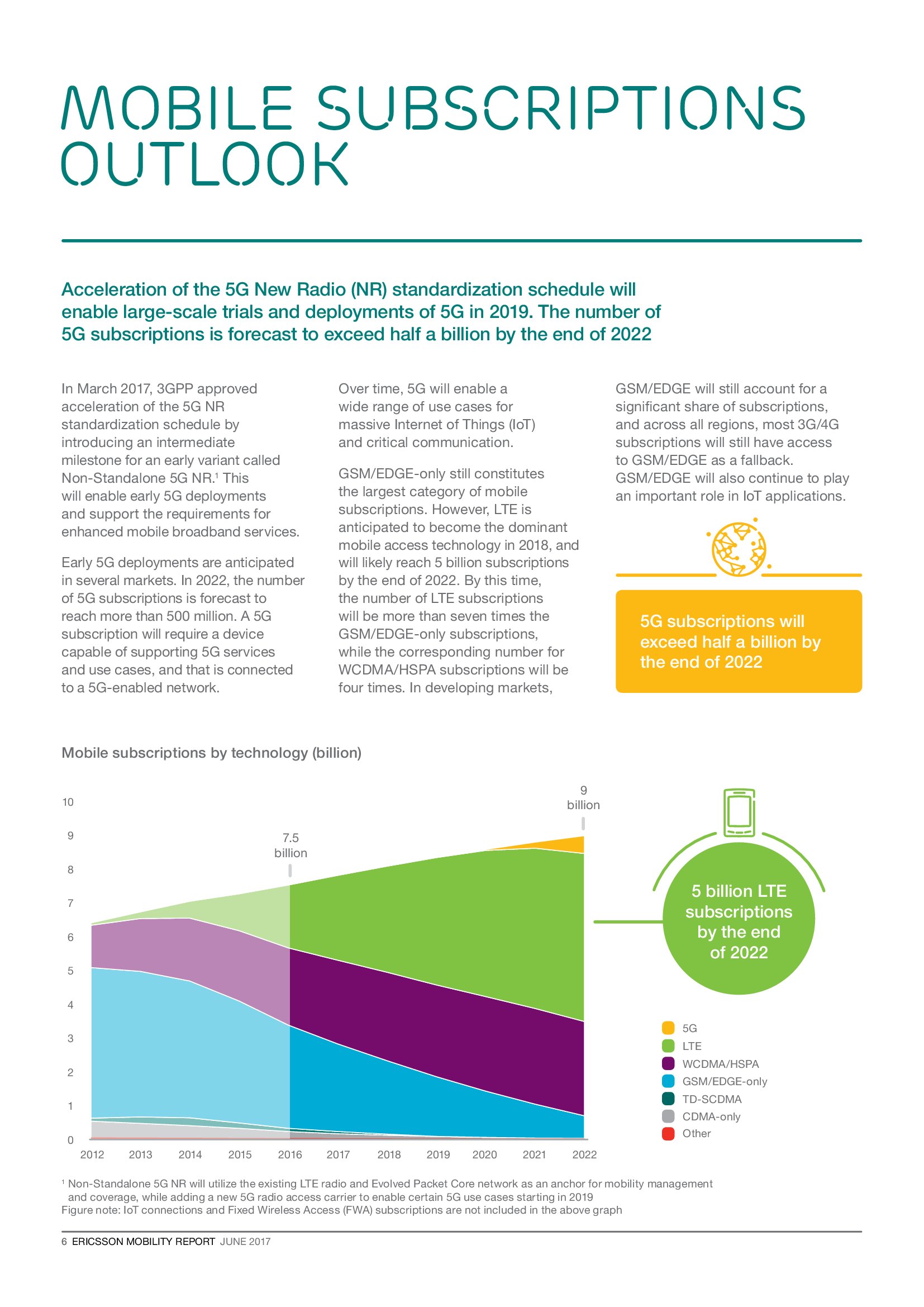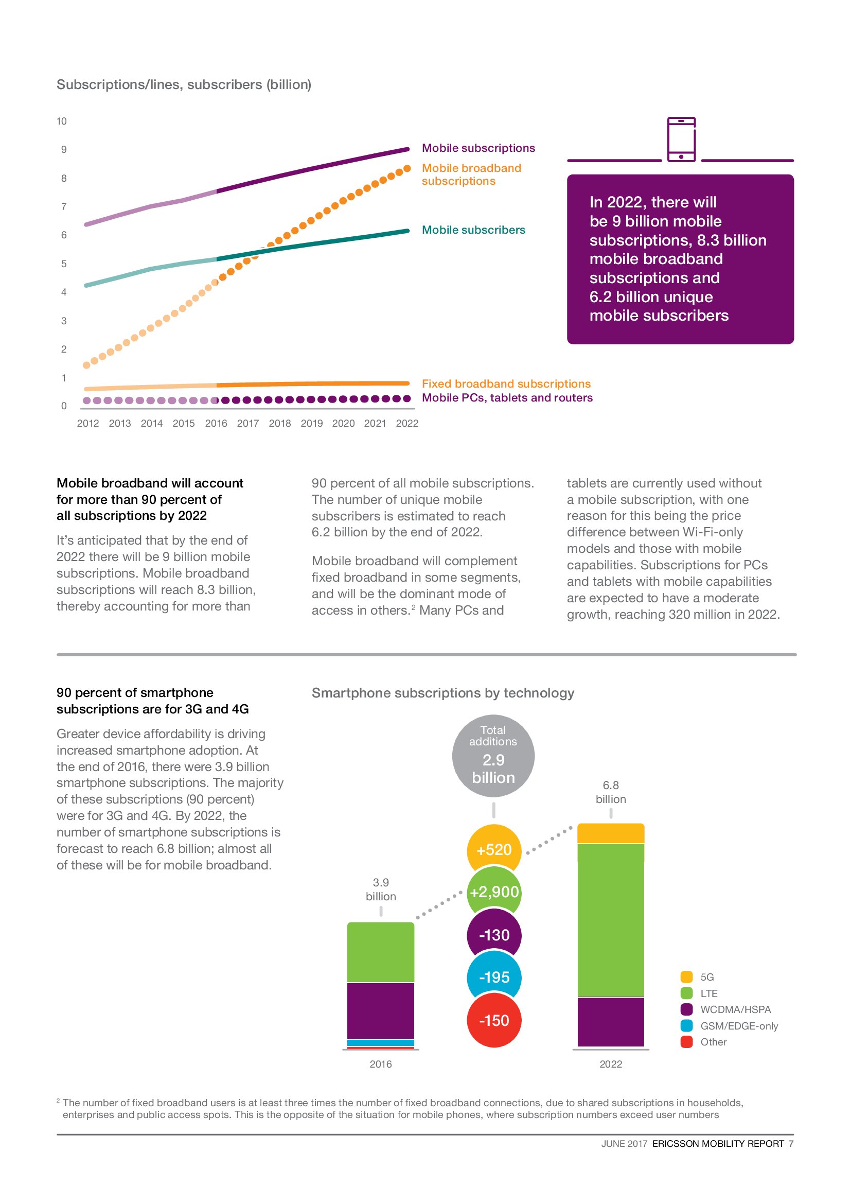 到2022年,全球开户入网手机数量将达到90亿,移动宽带用户将达到83亿人,独立手机用户将达到62亿人。