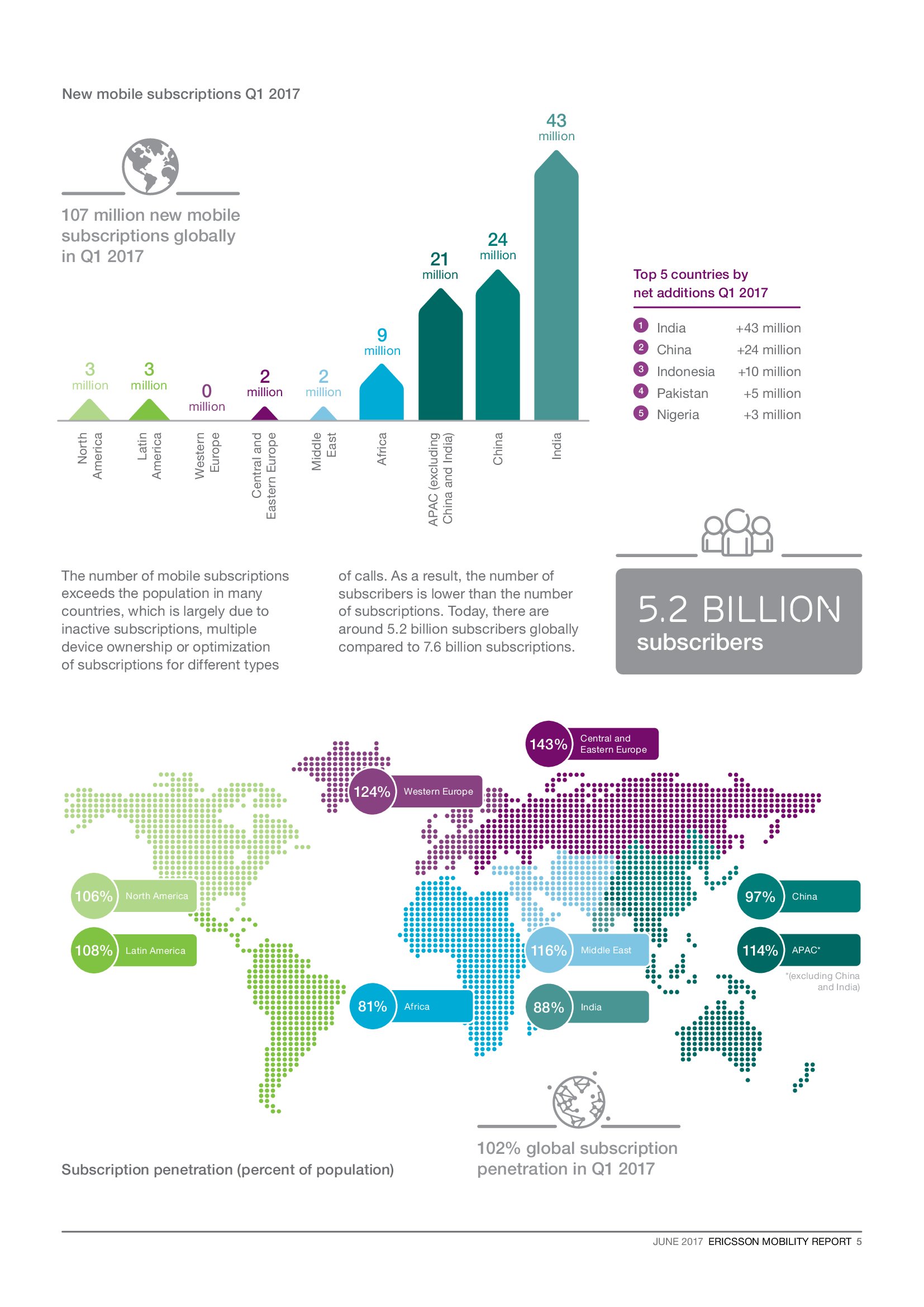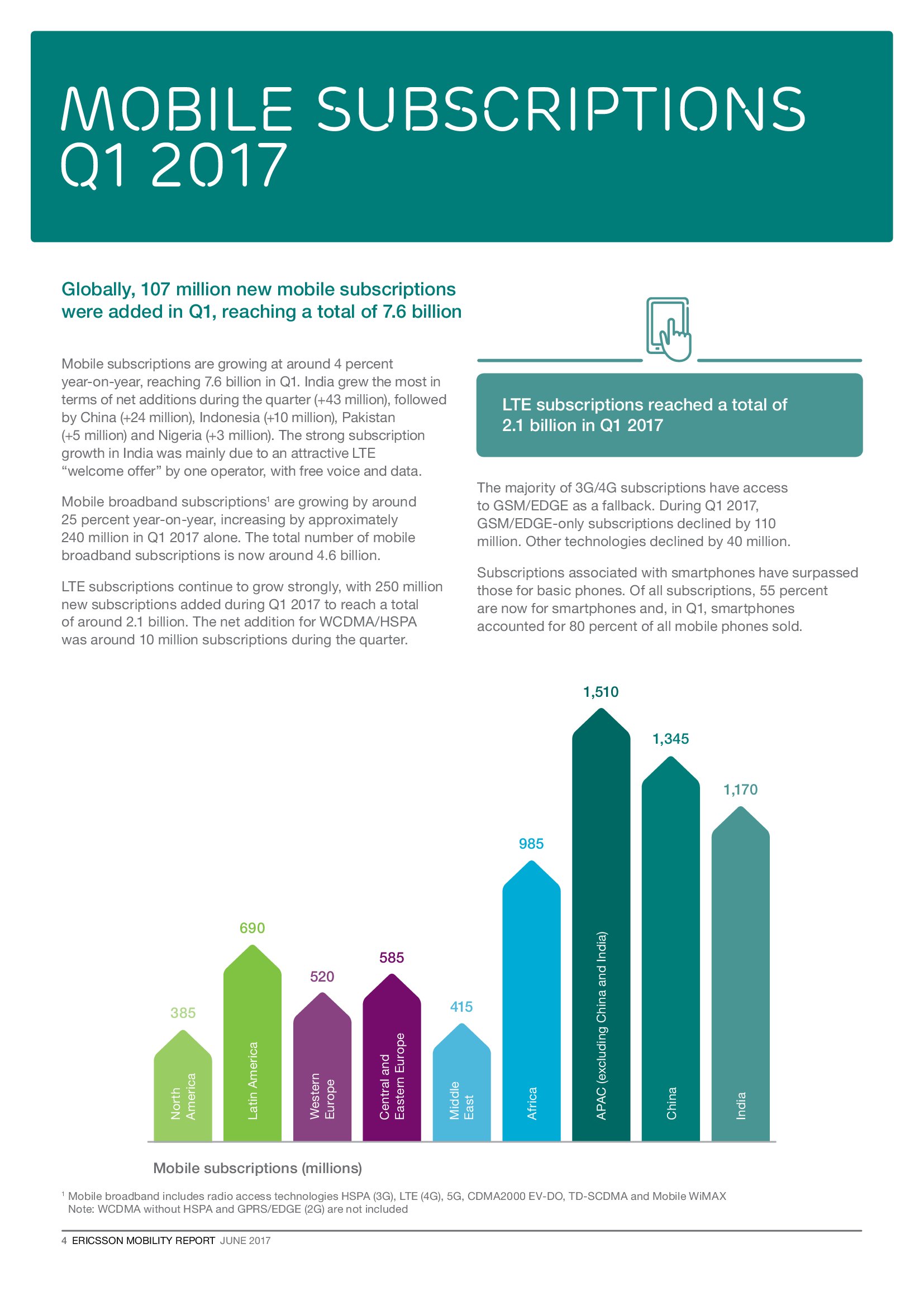 第一季度,全球新产生1.07亿开户入网手机,总数达到76亿,同比增长4%。