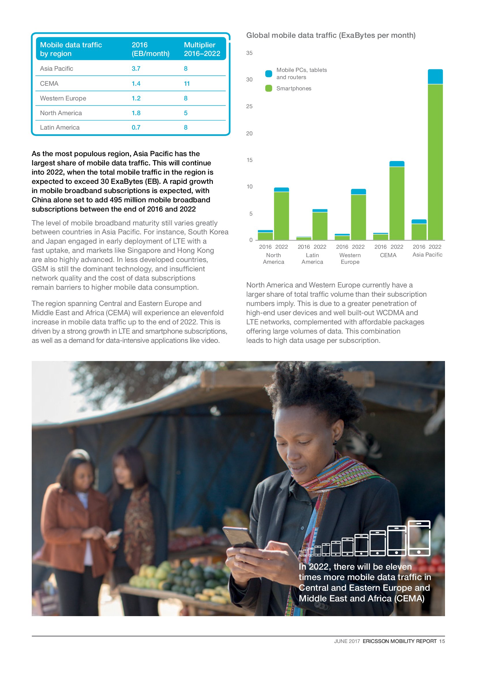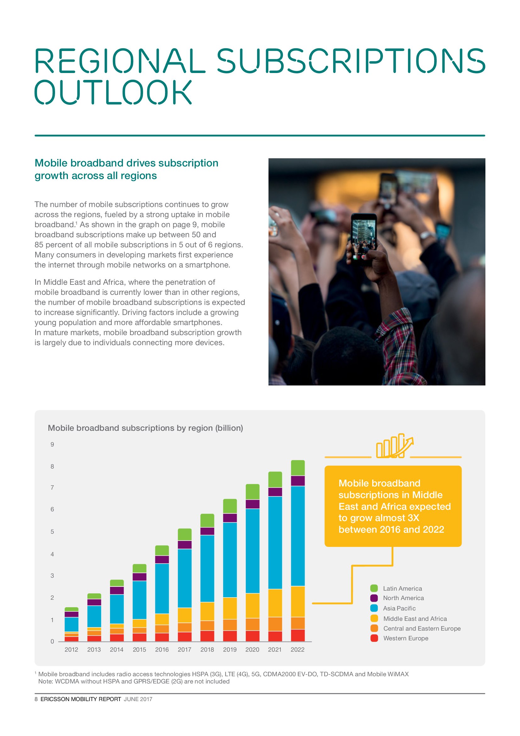 从整体来看,移动宽带推动了世界各地手机开户入网的增长。预计2016年到2022年,中东和非洲移动宽带用户数量增长3倍。