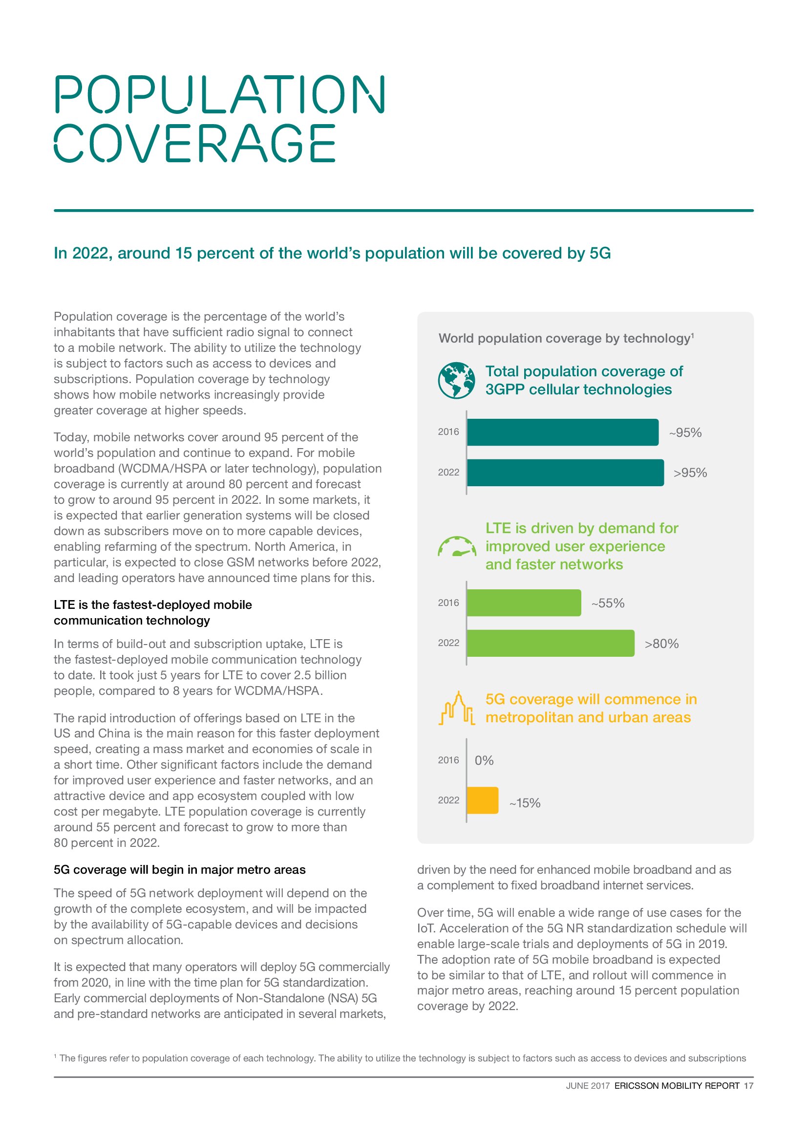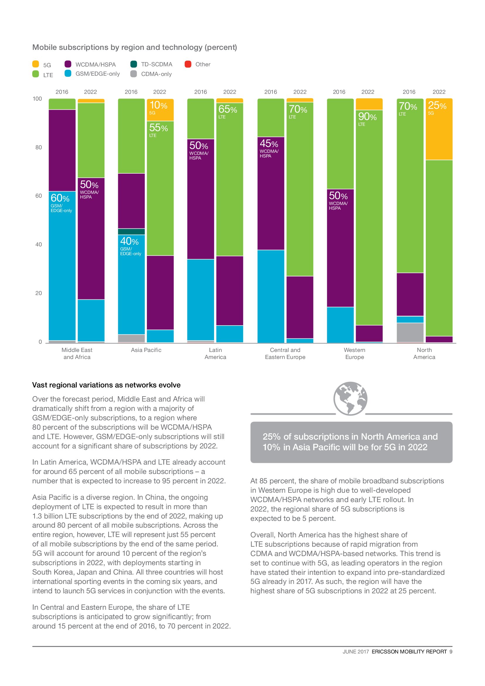 到2022年,25%的北美入网手机和10%的亚太地区入网手机将使用5G,全球约有15%的人口使用5G。